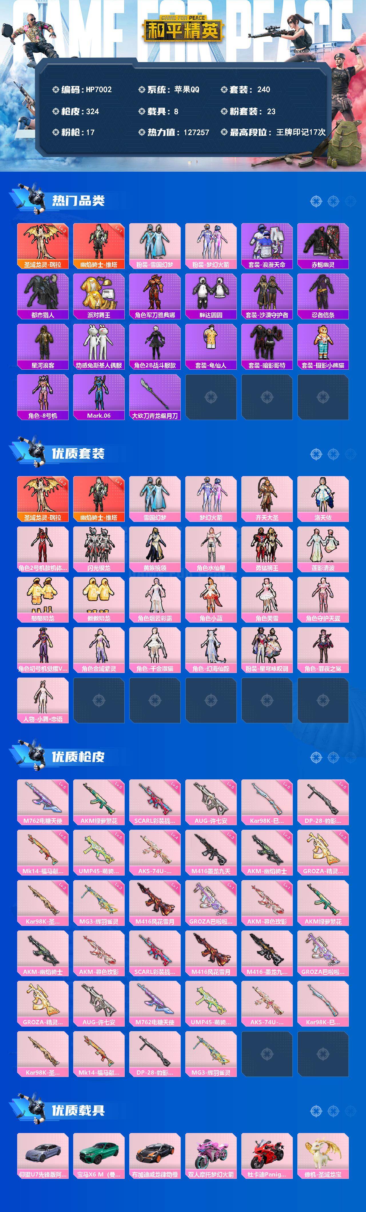 素材号-地铁满天赋-瑞拉3级/维塔/2号机款机体服/雪国幻梦/千金淑猫/AUG许七安5级/AK幽焰骑士3级/M4墨龙九天3级/狗砸精灵之光3级/M4风花雪月/8号机/蓝螳螂/金鞋/赤蝎/都市/浪漫天命/红眼罩/迅捷狂鲨/火箭少女/初号机觉醒Ver/小舞恋语/布加迪威龙(橙)/杜卡迪(红)/仰望(紫)/黑曜夜骑/迈凯伦(橙)/宝马(绿)(2红装23粉装17粉枪8载具)没战神框HP7002-14粉色飞行器-127257热力值-17王牌印记-240套装-324枪皮