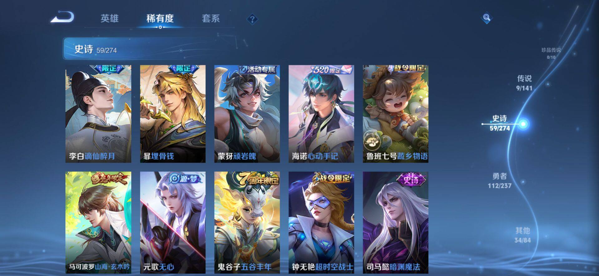 【传说皮肤】:马超神骥逐星野,司马懿九山相柳,澜愿照九州拓,桑启鸣野蒿,李信一念神魔,干将莫邪久胜战神,达摩黄金狮子座,孙尚香末日机甲,宫本武藏地狱之眼