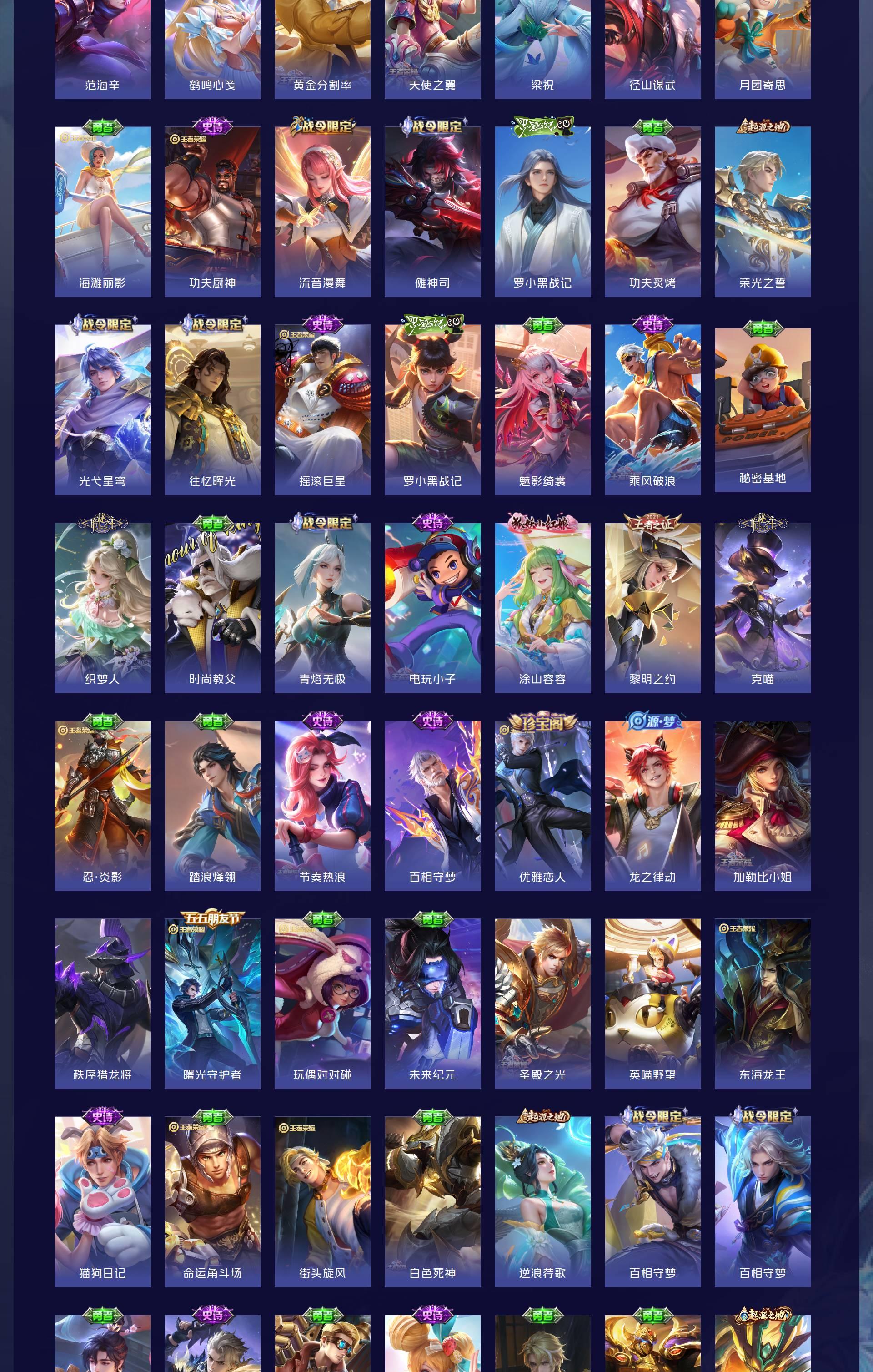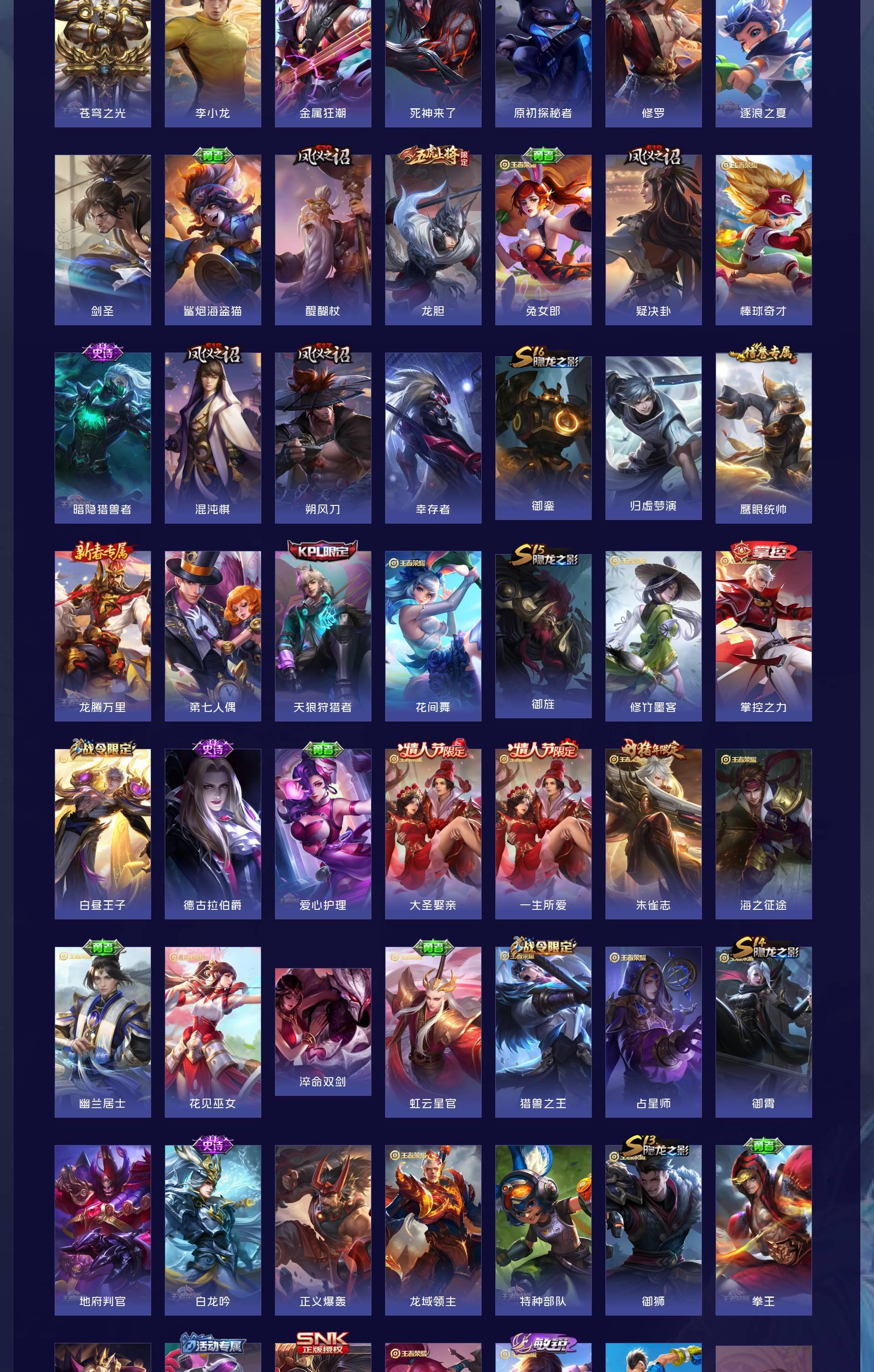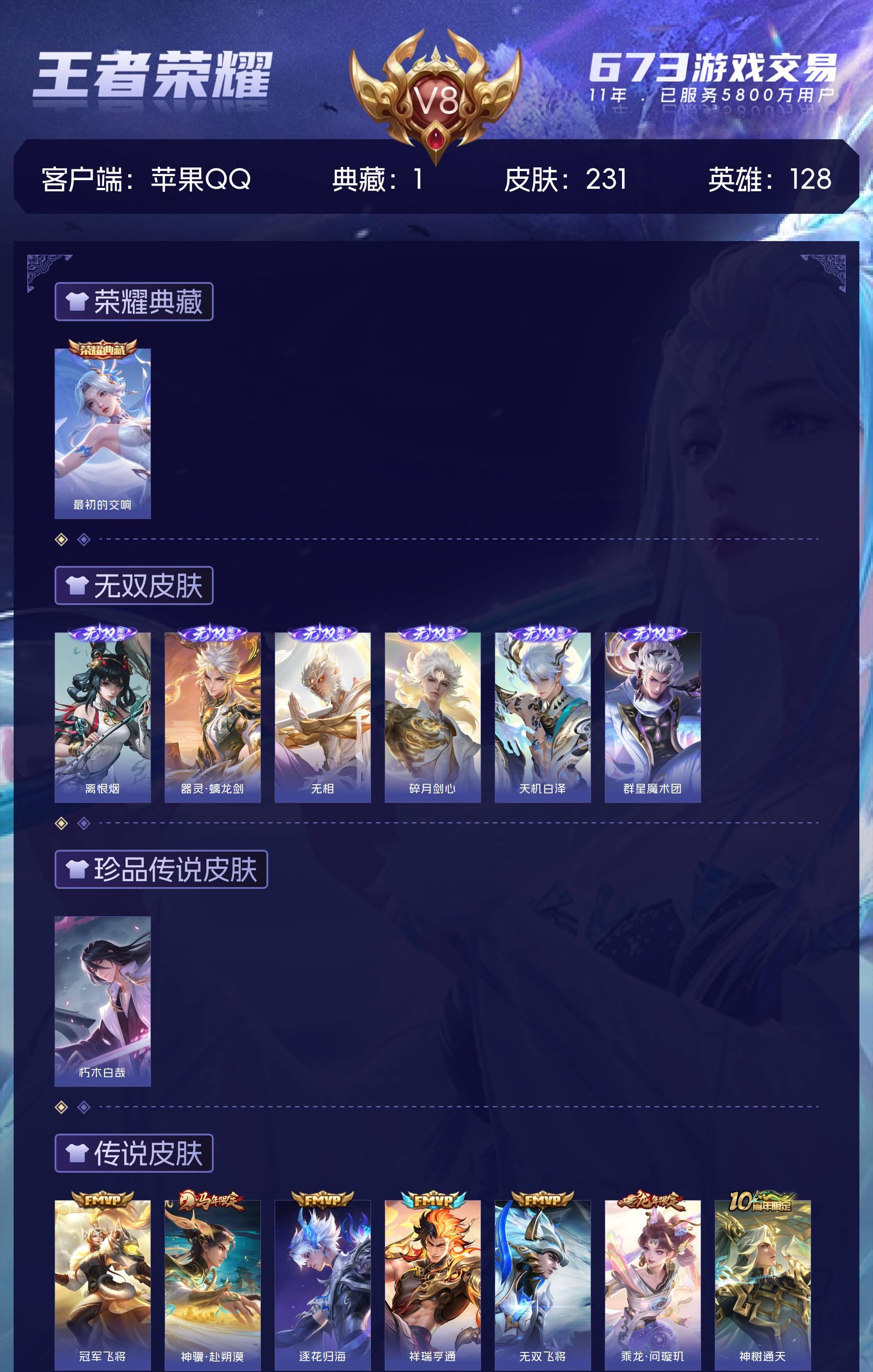 V8 皮肤231 英雄128 非凡王者 荣耀典藏1 无双皮肤6 珍品传说1 传说24