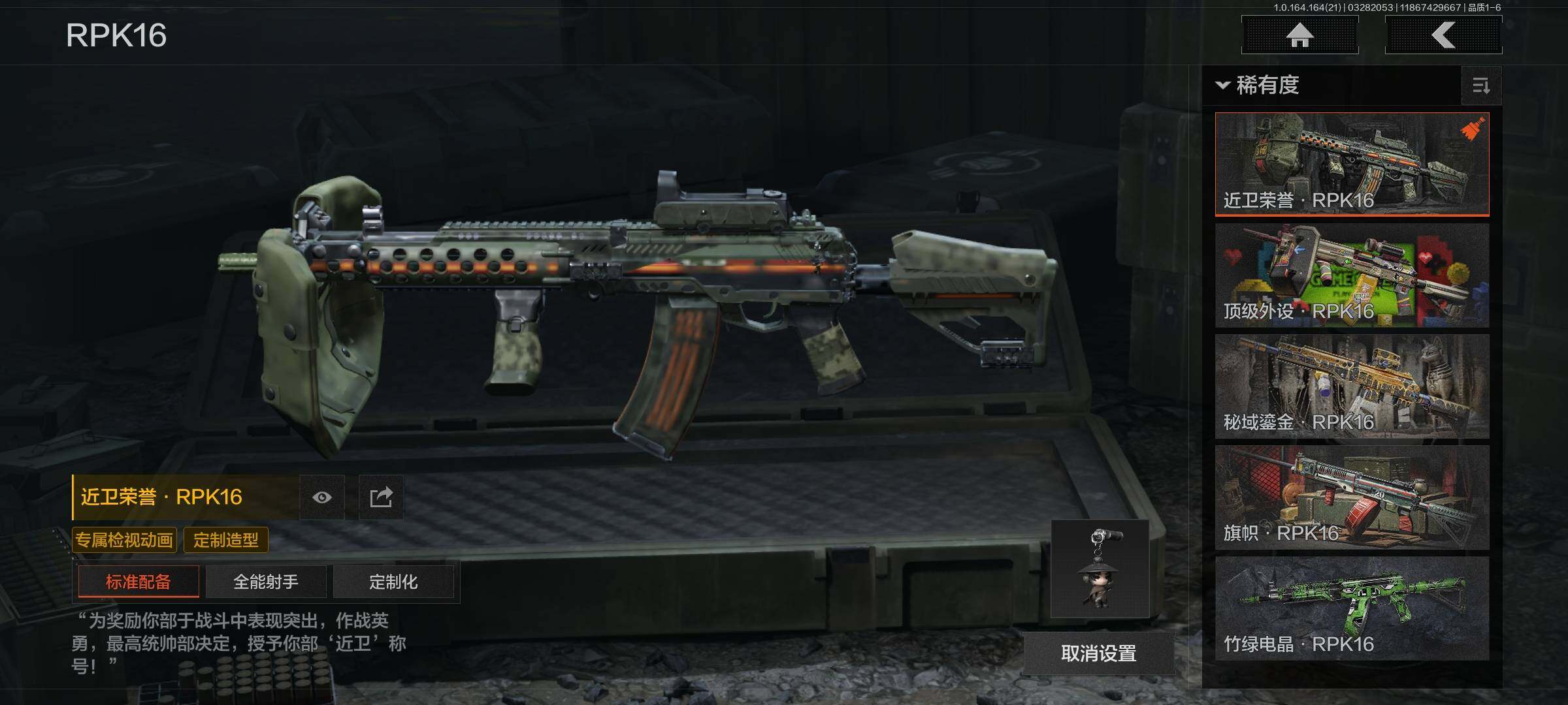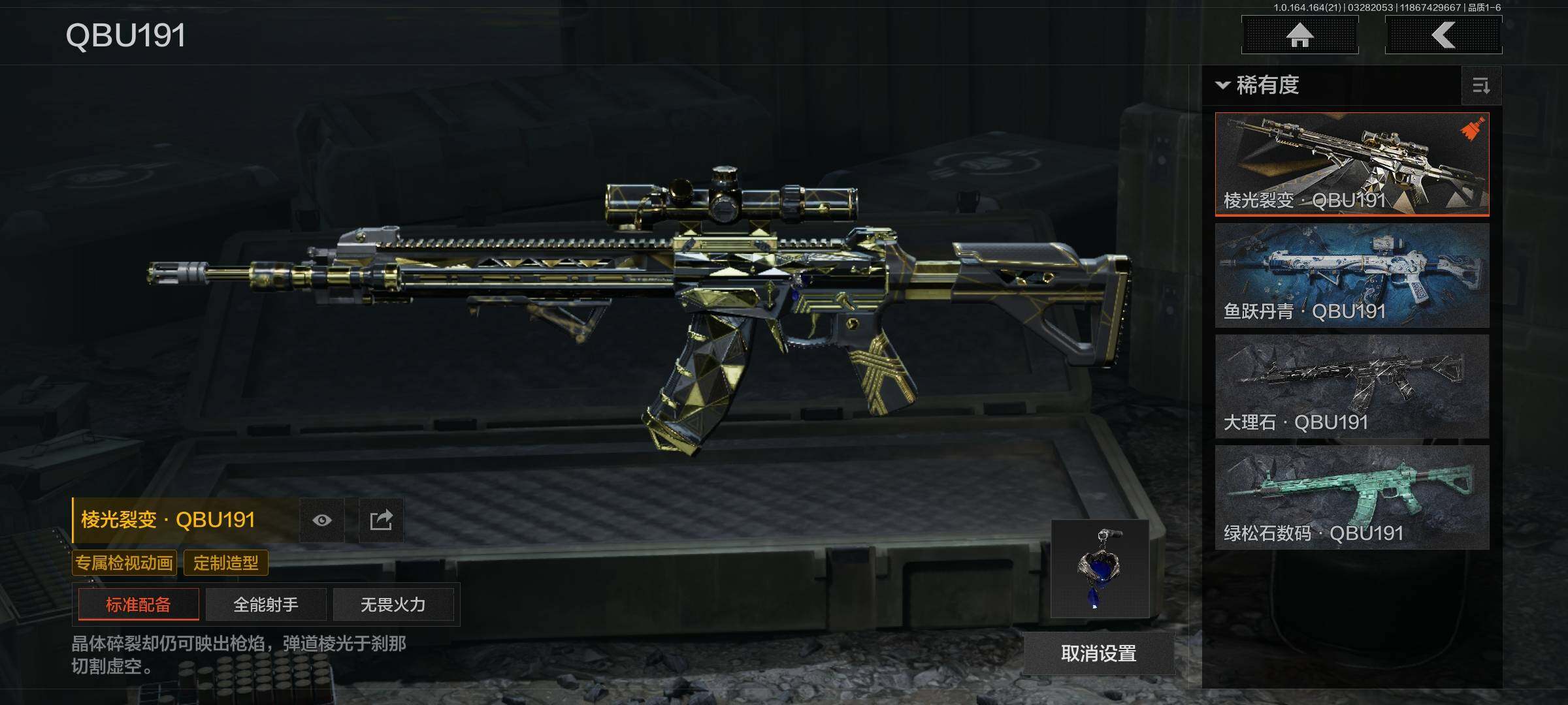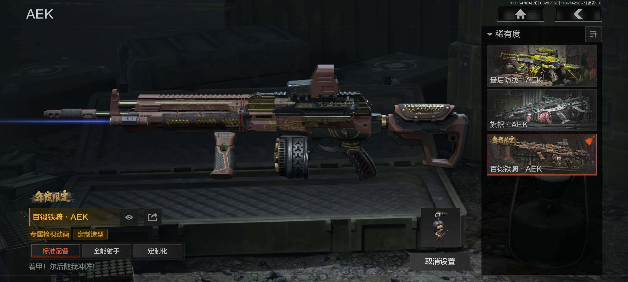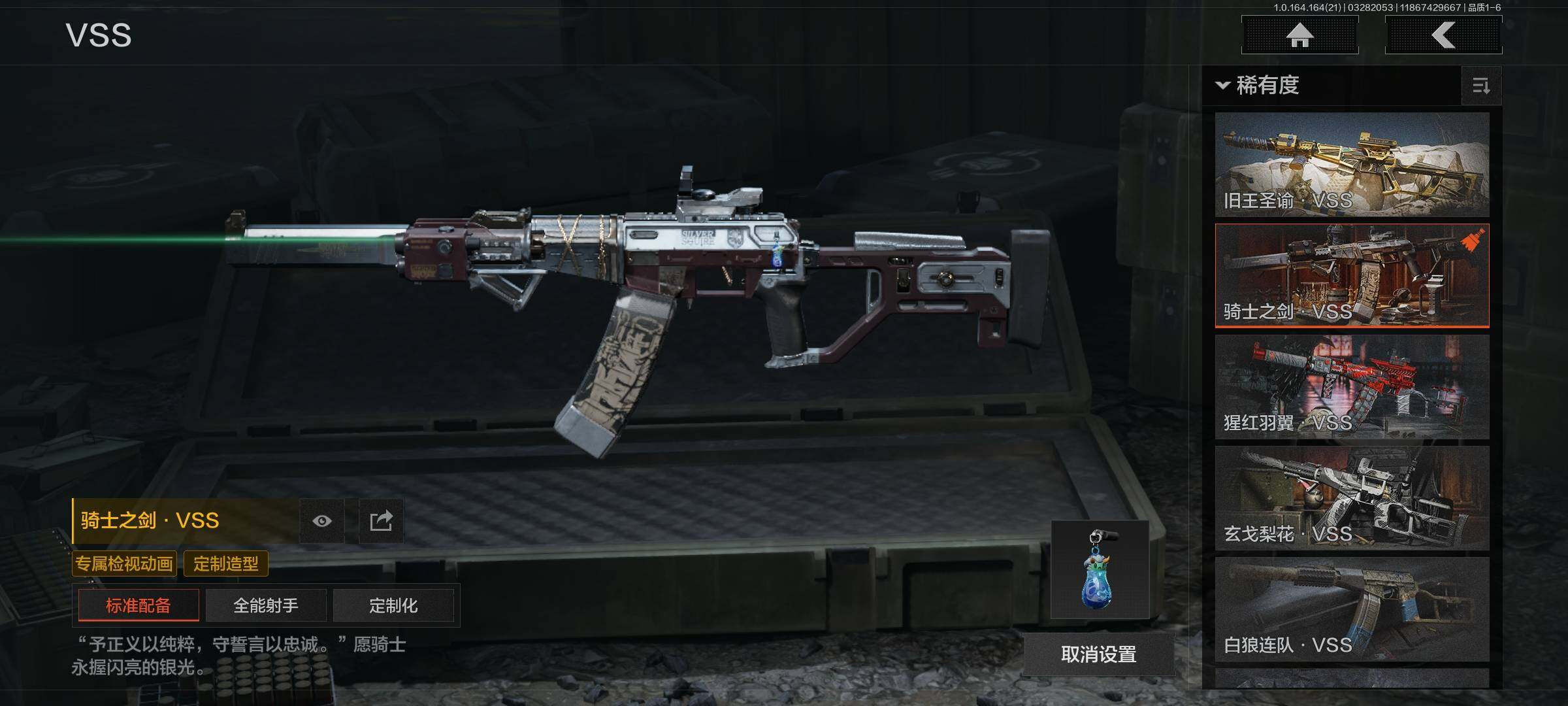 【金色枪皮】:包络战术AKM,地脉深处FAL,旧王圣谕·QBZ191,旧王圣谕·VSS,伦琴幻影·AX50,近卫荣誉·RPK16,干炼铁阵·MK14,利齿风暴·MPX,骑士之剑·VSS,棱光裂变·QBU191,告丧夜曲·