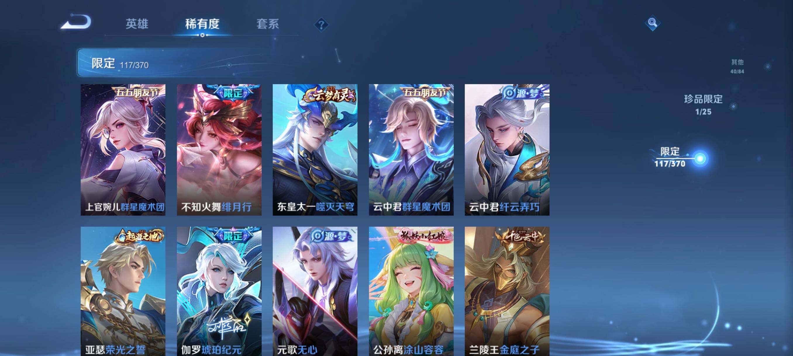 账号亮点:李白鸣剑曳影,花木兰九霄神辉 马可波罗怪盗基德 马超神骥逐星野,后羿神树通天,司空震愿照山河定,澜愿照九州拓,桑启鸣野蒿,云中君群星魔术团,墨子黄金天蝎座,海月金乌负日,吕布曦玄引,孙尚香乘龙问璇玑,孙策乘龙淬吴钩,赵云乘龙铭钟鼎,澜逐花归海,马可波罗妄想实况,夏洛特浮生妄,李信山海炽霜斩,不知火舞绯月行,鲁班七号寅虎瑞焰,赵云淬星耀世,虞姬启明星使,关羽武圣,李信一念神魔,刘备时之