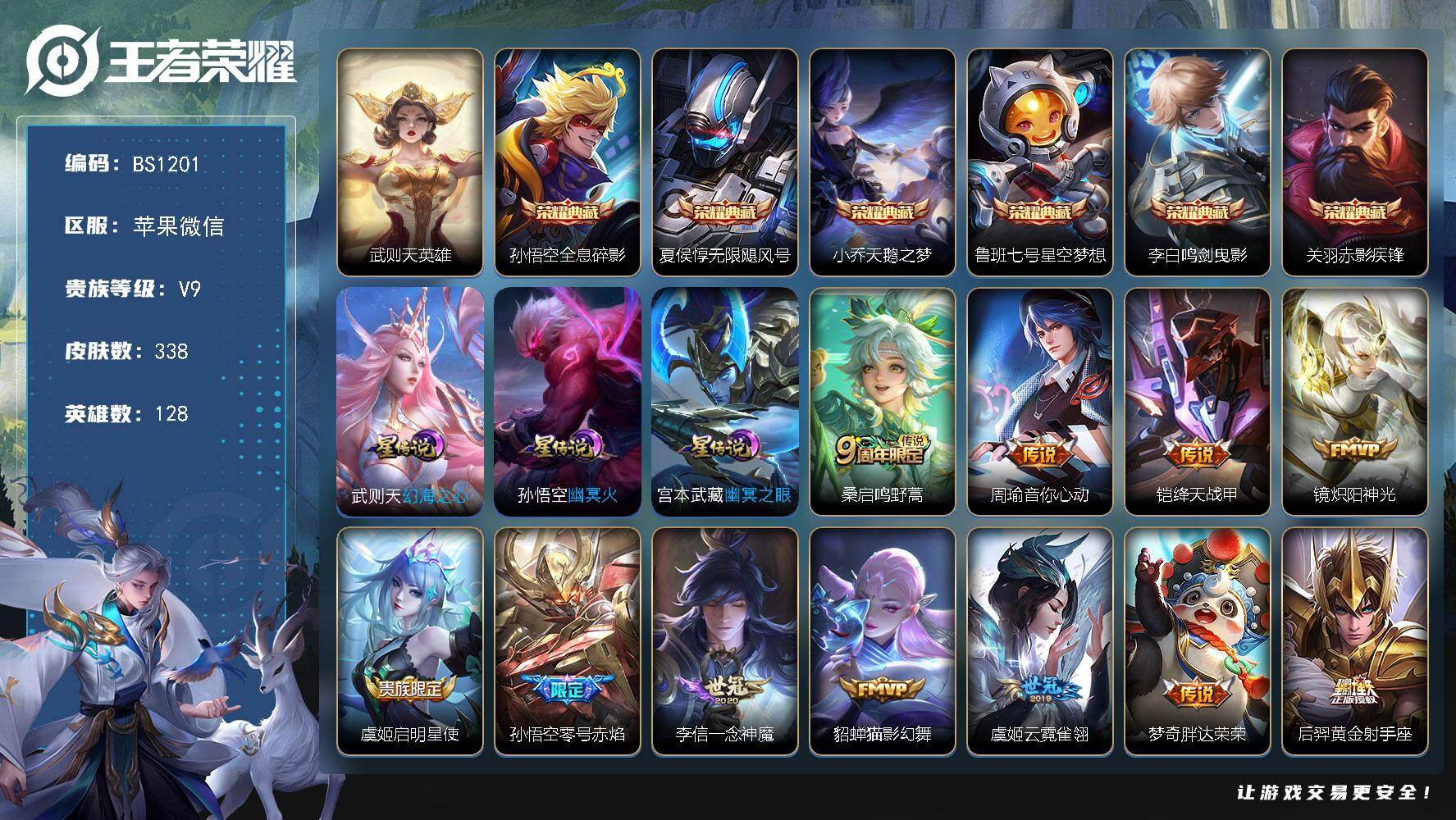苹果WX-V9-至尊星耀II段位-128英雄-338皮肤-6典藏皮肤-1典藏英雄-14传说-99史诗