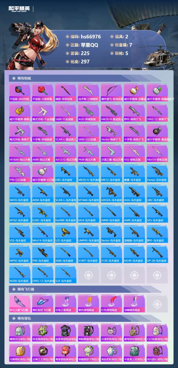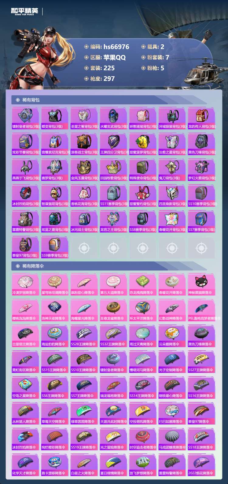 hs66976 苹果手Q-24王牌印记-7粉装-5特效枪-2载具-93067热力值-225套装-29