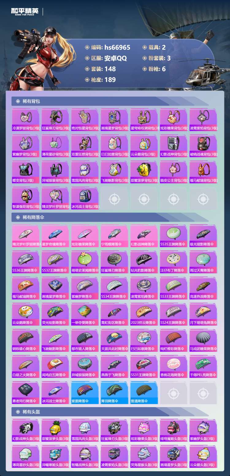 hs66965 安卓手Q-8王牌印记-3粉装-6特效枪-2载具-54141热力值-148套装-189