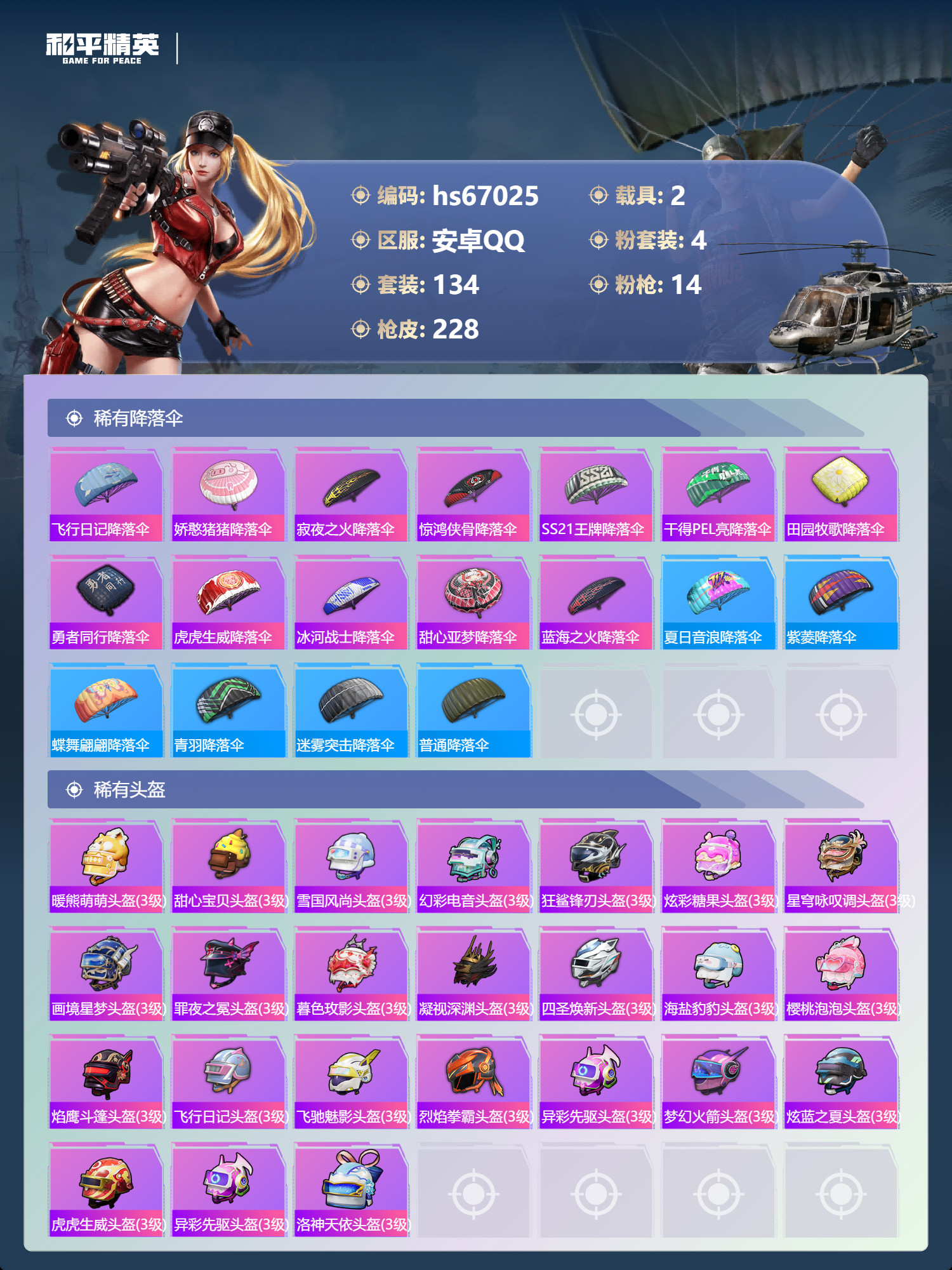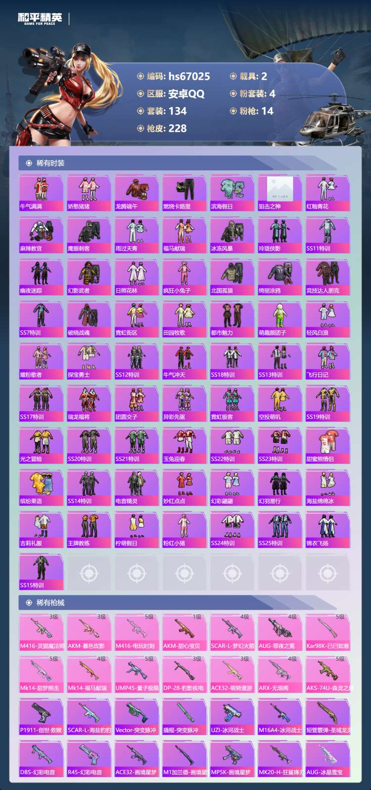 hs67025 安卓手Q-3王牌印记-4粉装-14特效枪-2载具-73026热力值-134套装-22