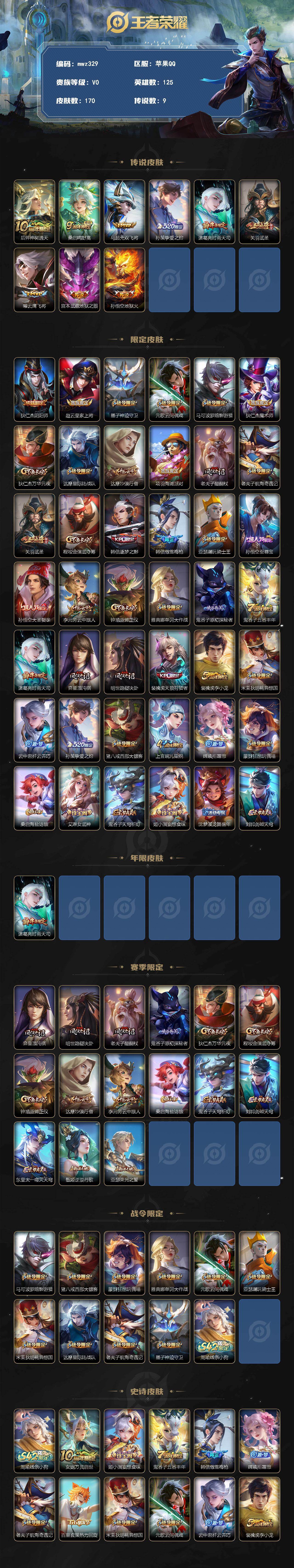 【mwz329】苹果Q-V0-最强王者段位-125英雄-170皮肤-9传说-4