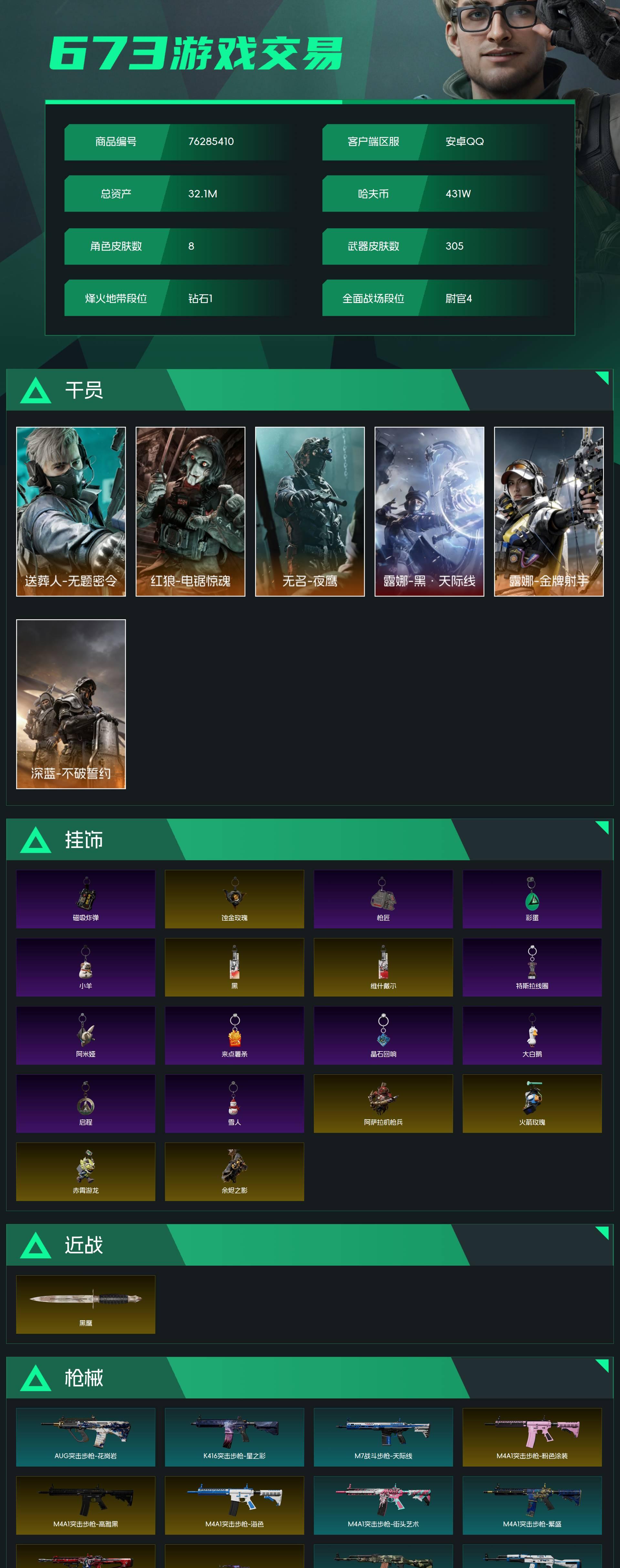 烽火段位钻石1 战场段位尉官4 总资产32.1M 哈夫币431W 干员8 挂饰30 近战2 枪械305 载具19