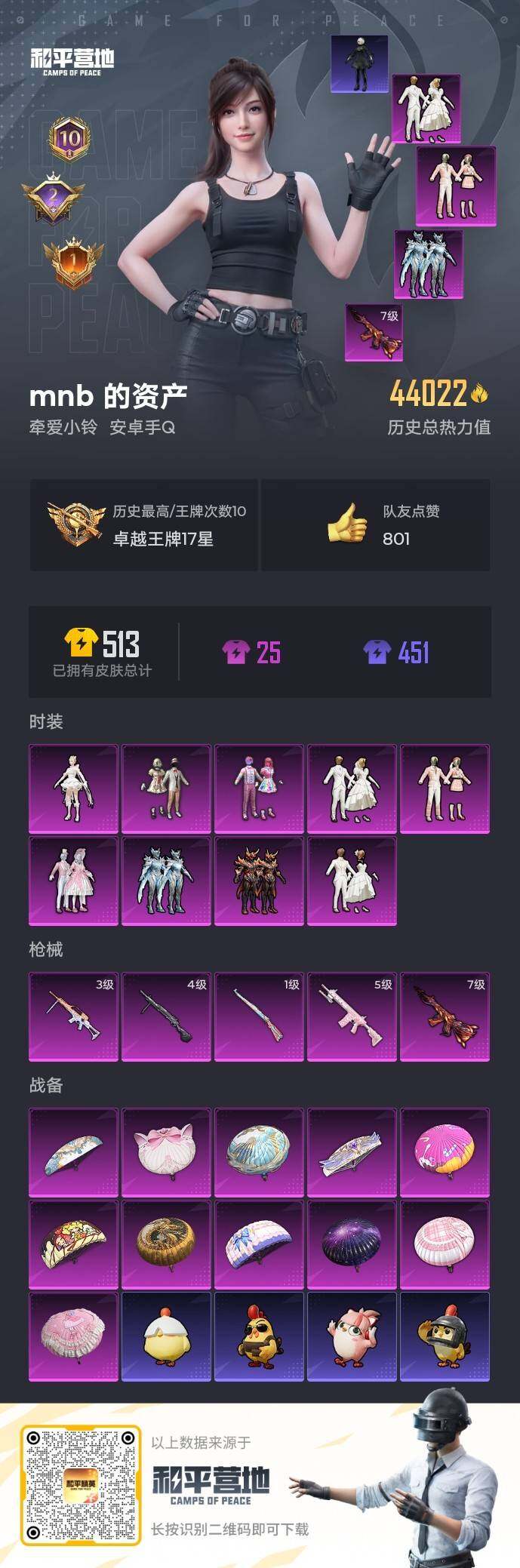 105套装/枪械5/装备165/战备102/王牌印记10/热力值44021/