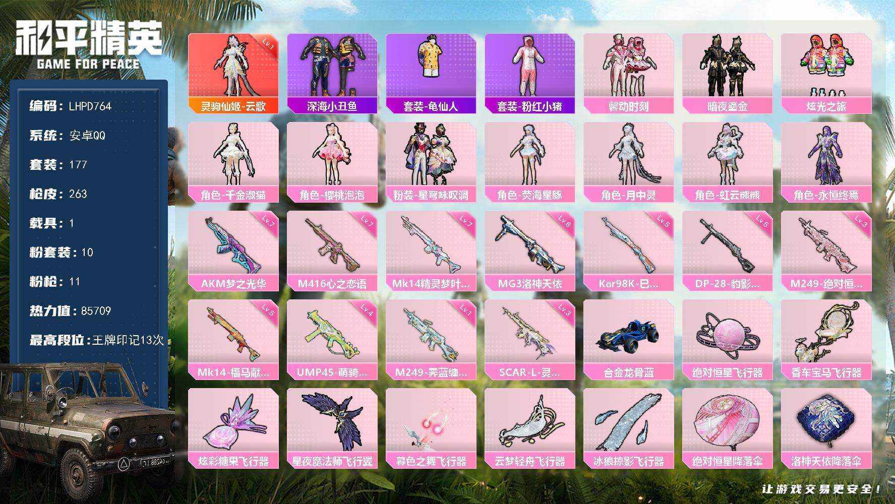 极品公主号【店主推荐捡漏号!可直接换绑】安卓 手Q-1神装-10粉装-11特效枪-1载具-7粉色飞行器-85709热力值-13王牌印记-177套装-263枪皮【红色神装等级】:灵驹仙姬-云歌(一级)【红色角色神装】:灵驹仙姬-云歌【热门品类】:套装-深海小丑鱼,套装-龟仙人,套装-粉红小猪【粉色套装】:粉装-馨动时刻,粉装-暗夜鎏金,粉装-炫光之旅,角色-千金淑猫,角色-樱桃泡泡,粉装-星穹咏叹
