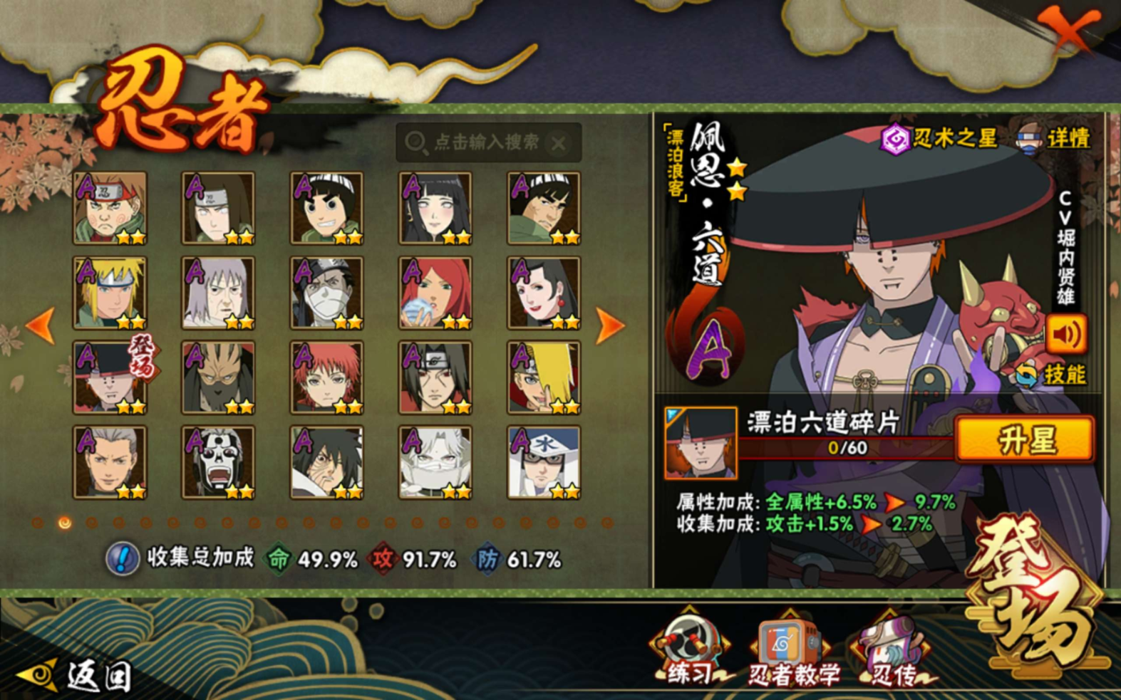 【S级忍者】旗木卡卡西「须佐能乎」(3星),宇智波斑「秽土转生·解」(3星),宇智波佐助「永恒万花筒」(3星),大筒木桃式(3星),艾「忍界大战」(3星),宇智波斑「白面具」(3星),波风水门「秽土转生」(3星),自来也「舞之豪杰」(3星),宇智波鼬「须佐能乎」(3星),漩涡鸣人·宇智波佐助(3星),