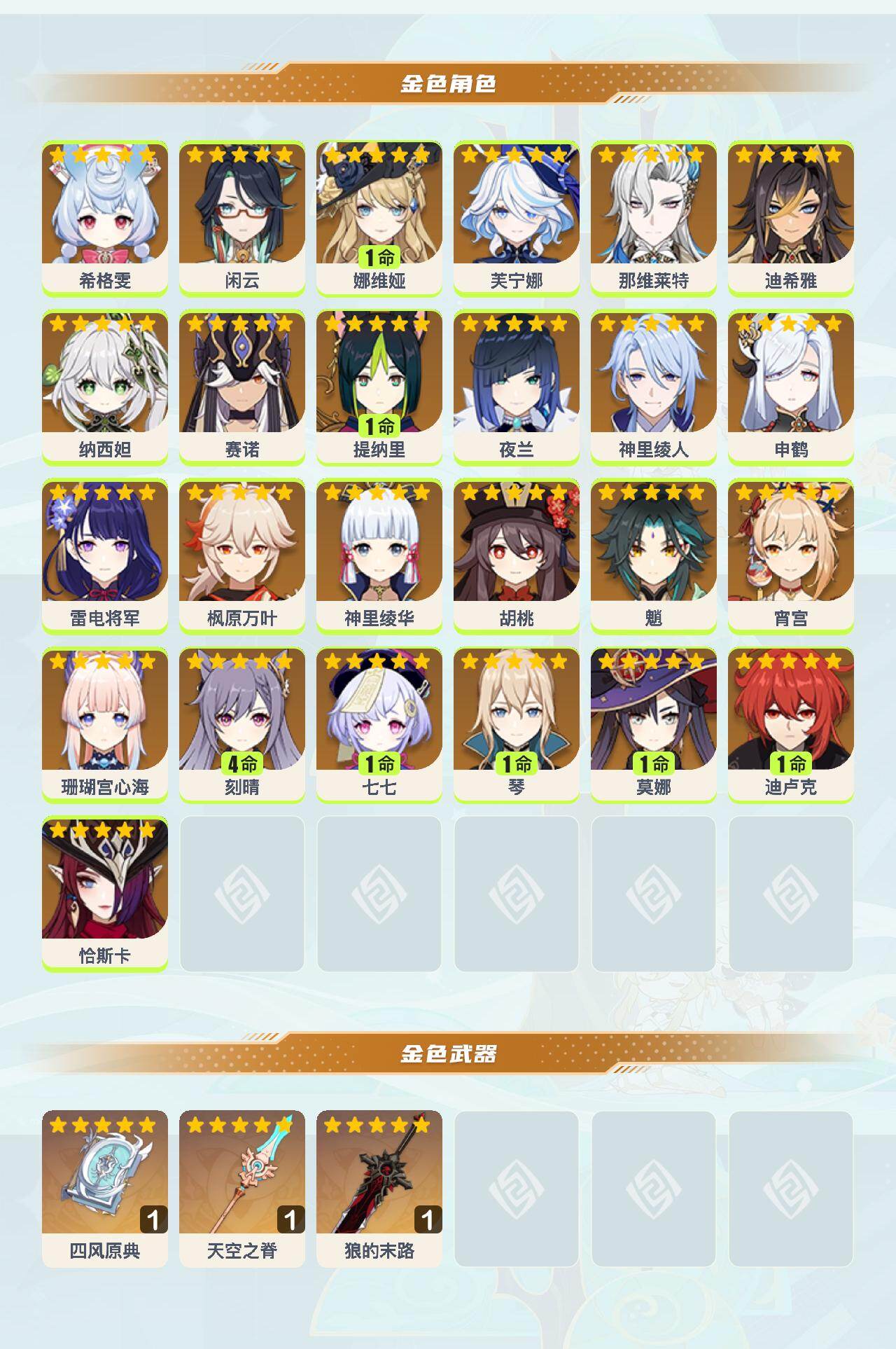 0命希格雯,0命闲云,1命娜维娅,0命芙宁娜,0命那维莱特,0命迪希雅,0命纳西妲,0命赛诺,1命提纳里,0命夜兰,0命神里绫人,0命申鹤,0命雷电将军,0命枫原万叶,0命神里绫华,0命胡桃,0命魈,0命宵宫,0命珊瑚宫心海,4命刻晴,1命七七,1命琴,1命莫娜,1命迪卢克,0命恰斯卡,精1四风原典,精1天空之脊,精1狼的末路