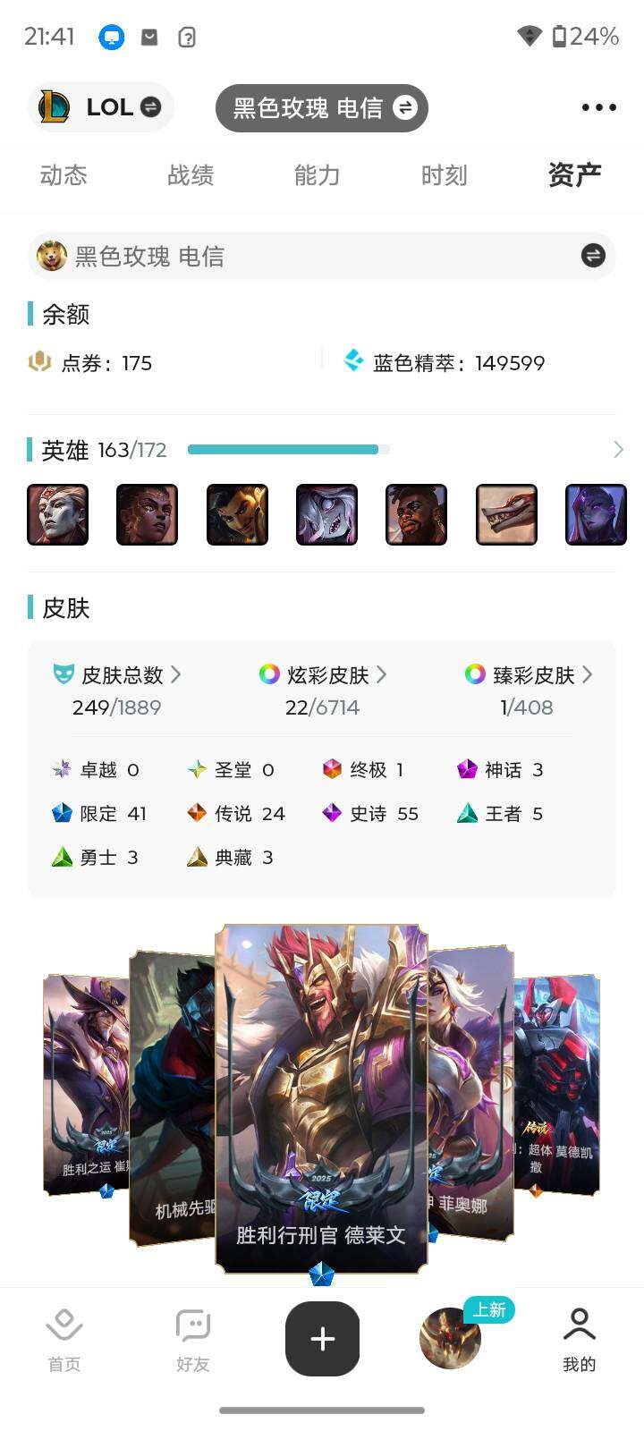 【店主推荐捡漏号】白银段位-163英雄-249皮肤-22炫彩-1终极-3神话-41限定-24传说-55史诗