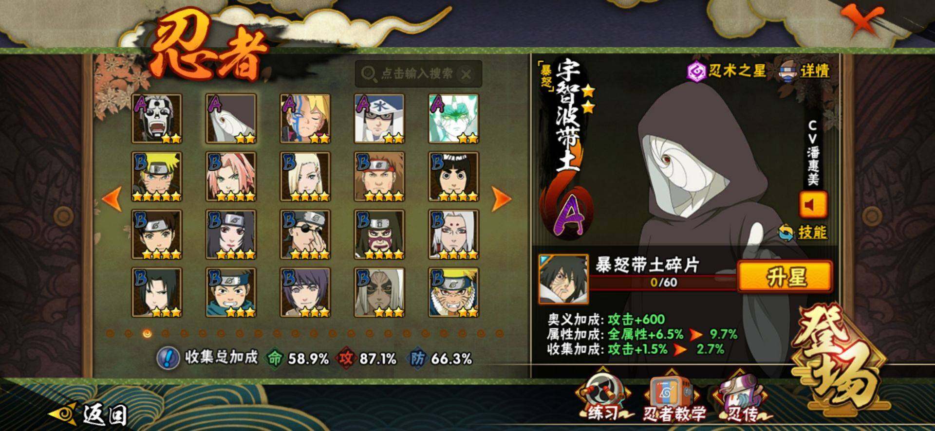 【S级忍者】:宇智波斑「秽土转生·解」(3星),春野樱「忍界大战」(3星),宇智波带土「忍界大战」(3星),宇智波鼬「须佐能乎」(3星),千手柱间「木叶创立」(3星),自来也「舞之豪杰」(3星),波风水门(3星),漩涡鸣人「九喇嘛连结」(3星),佩恩「天道」(3星),宇智波佐助「永恒万花筒」(3星),宇智波斑「五影会谈」(3星),漩涡鸣人·宇智波佐助(3星),宇智波带土「十尾人柱力」(3星)