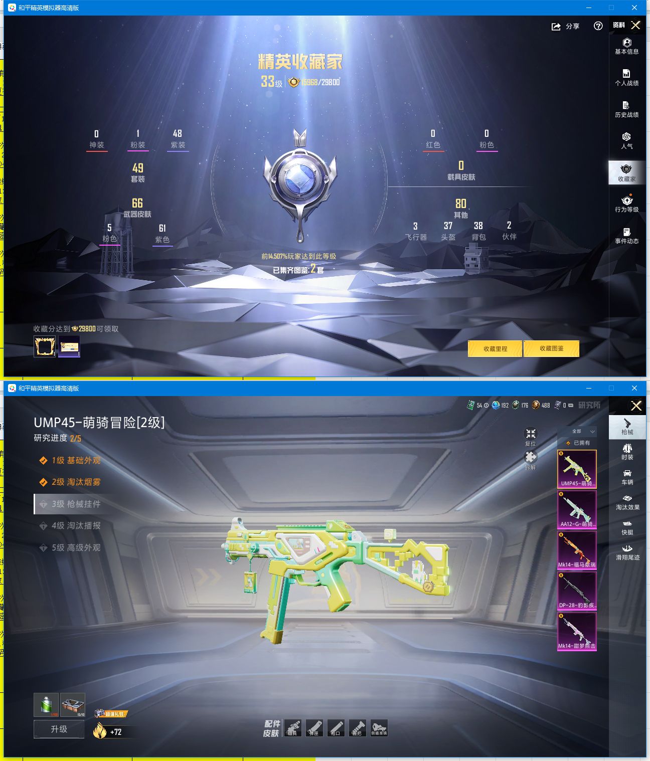 1粉装-5特效枪-49套装-72枪皮-4王牌印记-卓越王牌7星-19523热力值