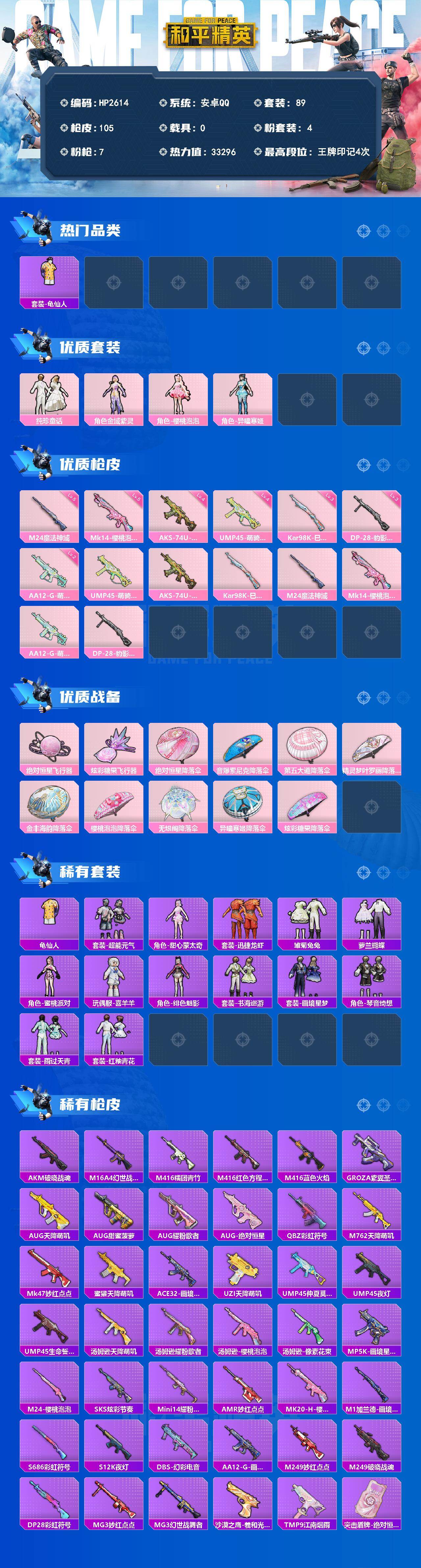 【HP2614】89套装/枪械7/装备115/战备80/王牌印记4/热力值33296/四级UMP45-萌骑冒险/四级AKS-74U-森灵之息/三级Kar98K-巳巳如意/五级M24-魔法神域/五级Mk14-樱桃泡泡/二级AA12-G-萌骑幻想/三级DP-28-豹影疾电/套装-龟仙人/粉装-纯珍童话/角色-金域紫灵/角色-樱桃泡泡/角色-异瞳寒姬/UMP45-萌骑冒险/AKS-74U-森灵之息/Kar98K-巳巳如意/M24-魔法神域/Mk14-樱桃泡泡/AA12-G-萌骑幻想/DP-28-豹影疾