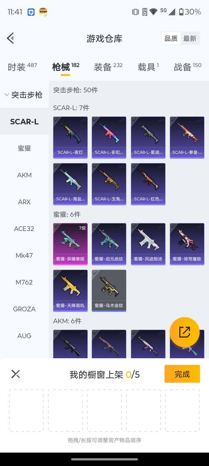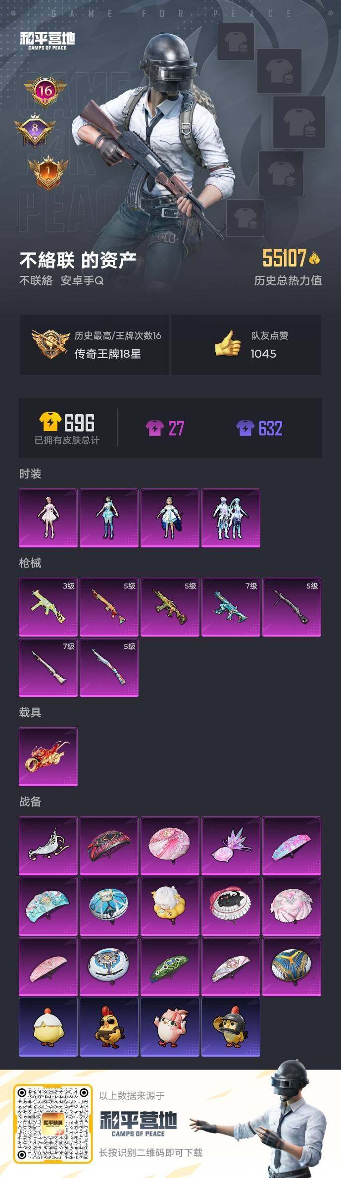131套装/枪械7/装备232/载具1/战备150/王牌印记16/热力值55107/