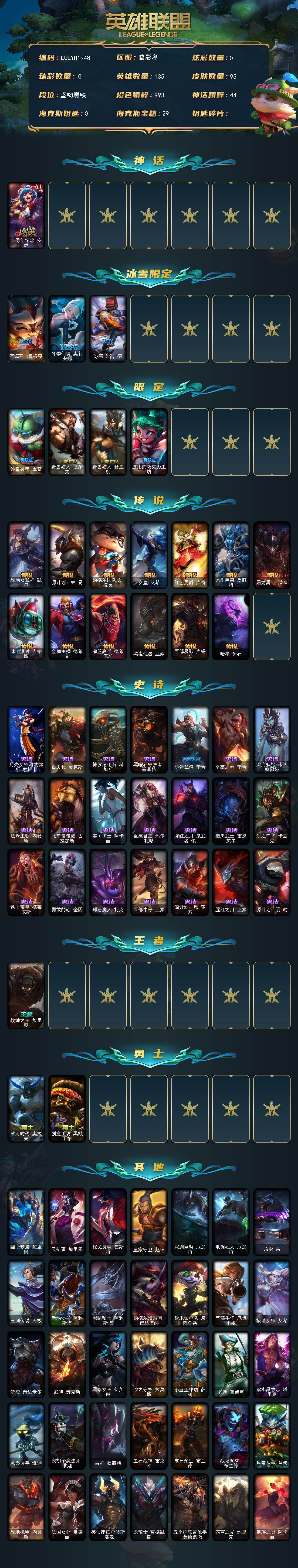 【LOLYH1948】135英雄/95皮肤/1神话/7限定/13传说/21史诗/未定级/十周年纪念安妮/圣诞开心鬼提莫/冬季仙境奥莉安娜/冰雪节辛吉德/外星装甲库奇/野兽猎人德莱文/野兽猎人瑟庄妮/波比的巧克力工坊/战场女武神凯尔/源计划林易/约德尔国队长提莫/女皇艾希/红色男爵库奇/冰川巨兽墨菲特/屠龙勇士潘森/泳池派对吉格斯/金牌主播德莱文/灌篮高手德莱厄斯/黑夜使者亚索/西部魔影卢锡安/暗星锤石/月光女神阿忒弥斯索拉卡/百夫长贾克斯/侏罗纪化石科加斯/黑曜石守护者墨菲特/防弹武僧李青/至高