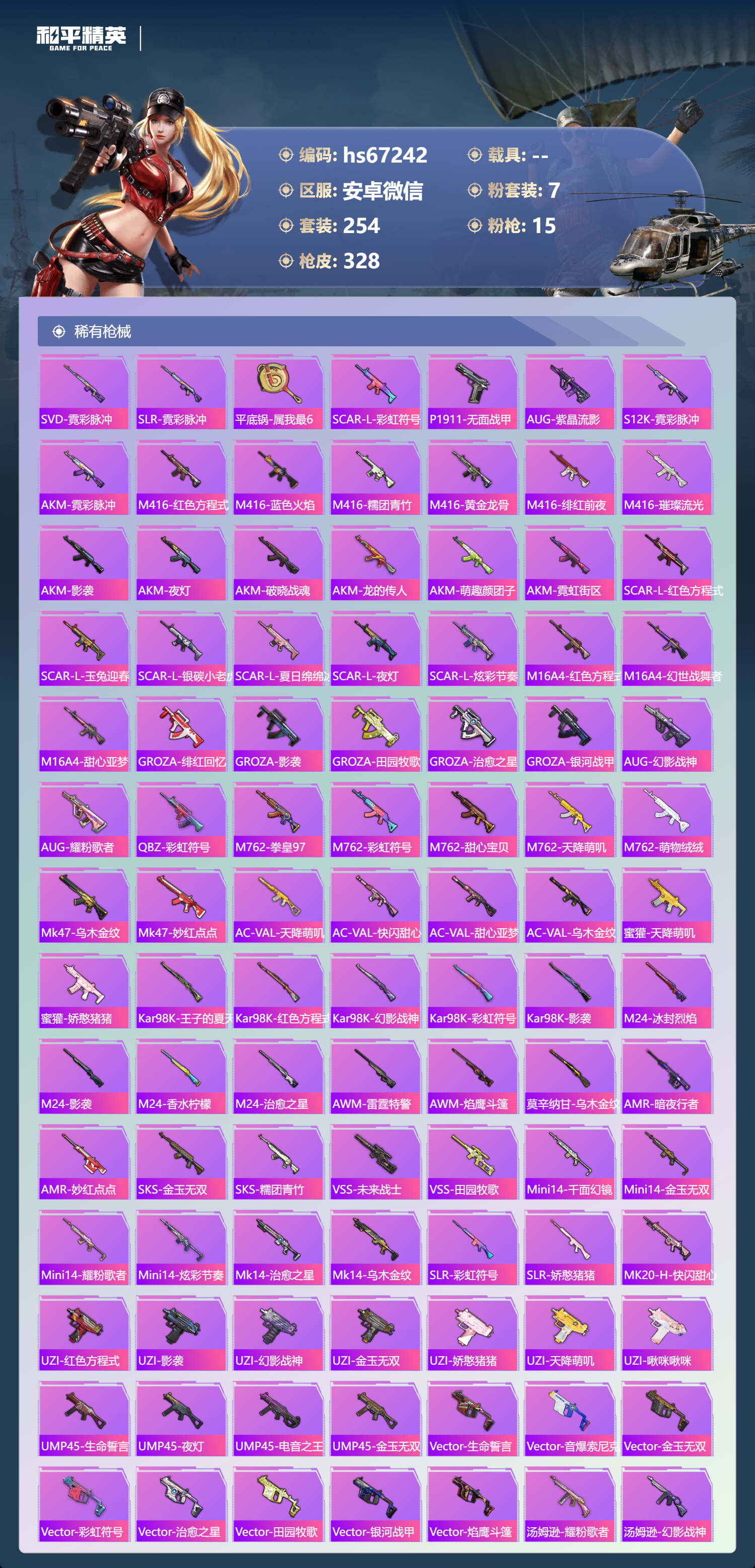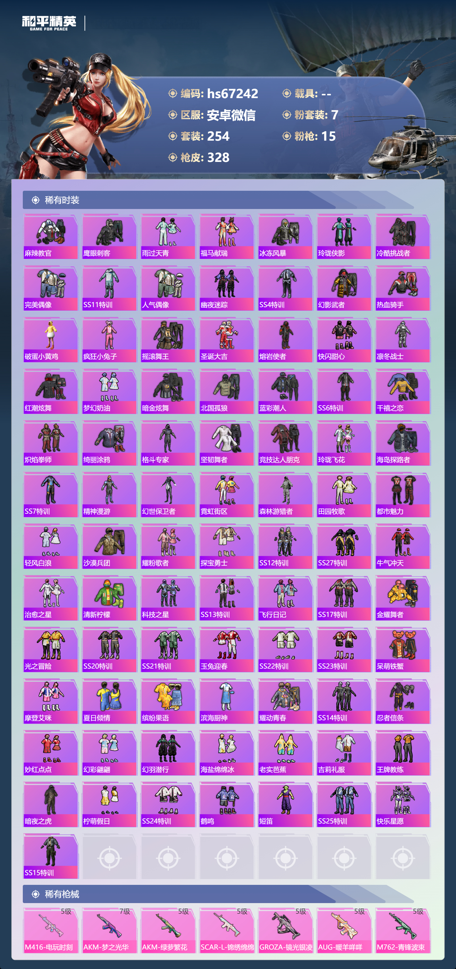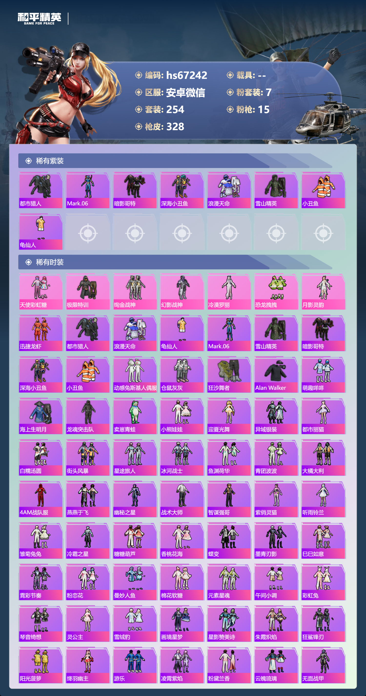 hs67242 安卓微信-15王牌印记-7粉装-15特效枪-热力值-254套装-328枪皮-1卓越印记-1传奇印记