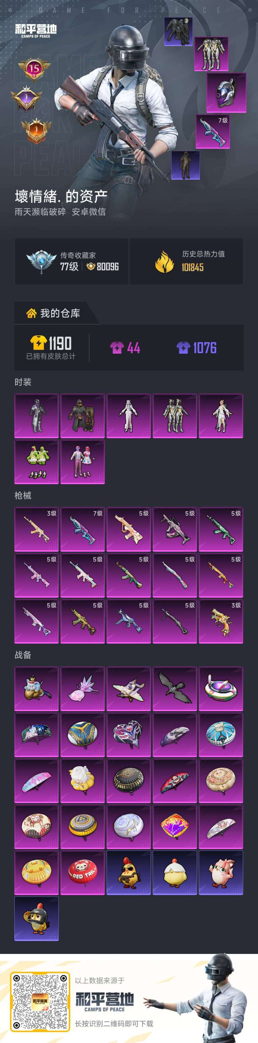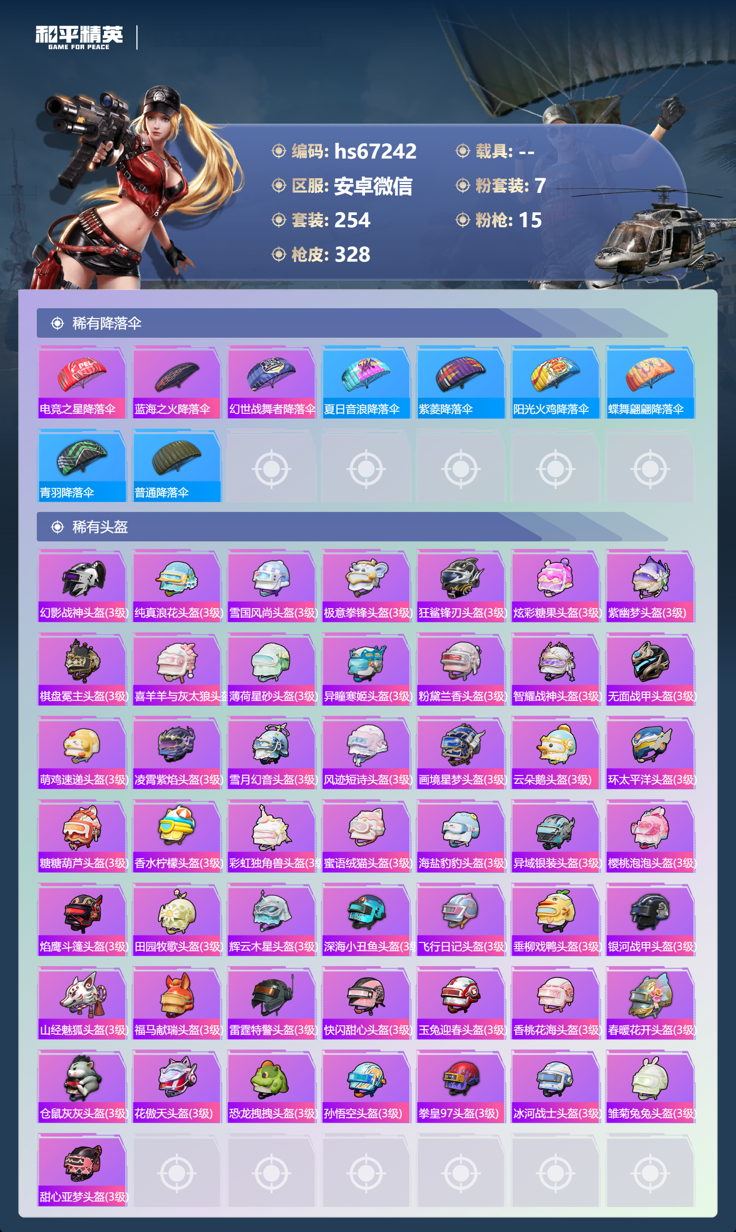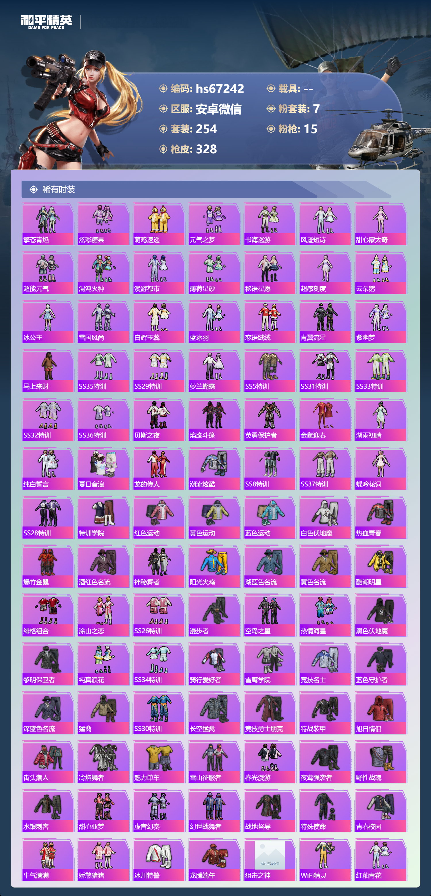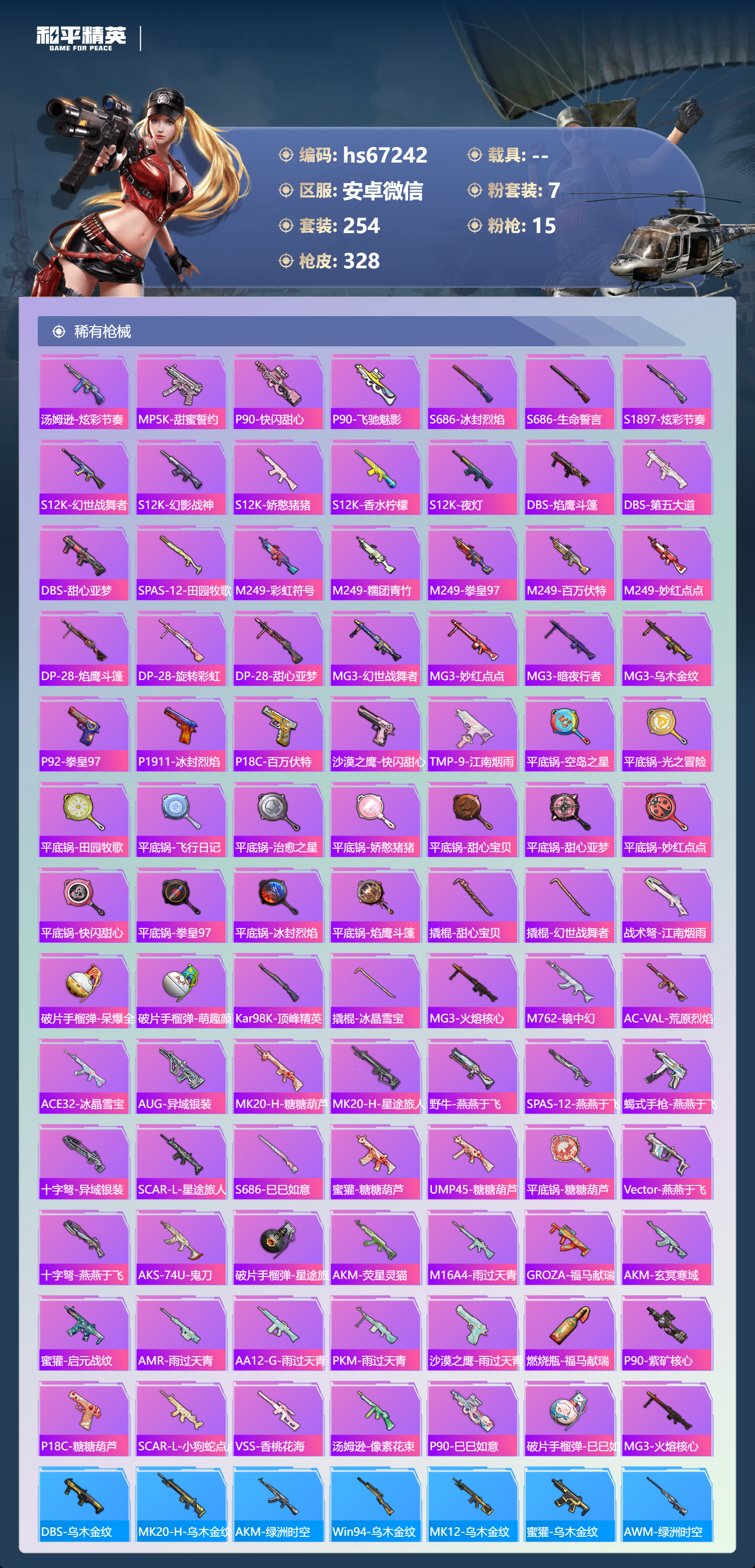hs67242 安卓微信-15王牌印记-7粉装-15特效枪-热力值-254套装-328枪皮-1卓越印记-1传奇印记