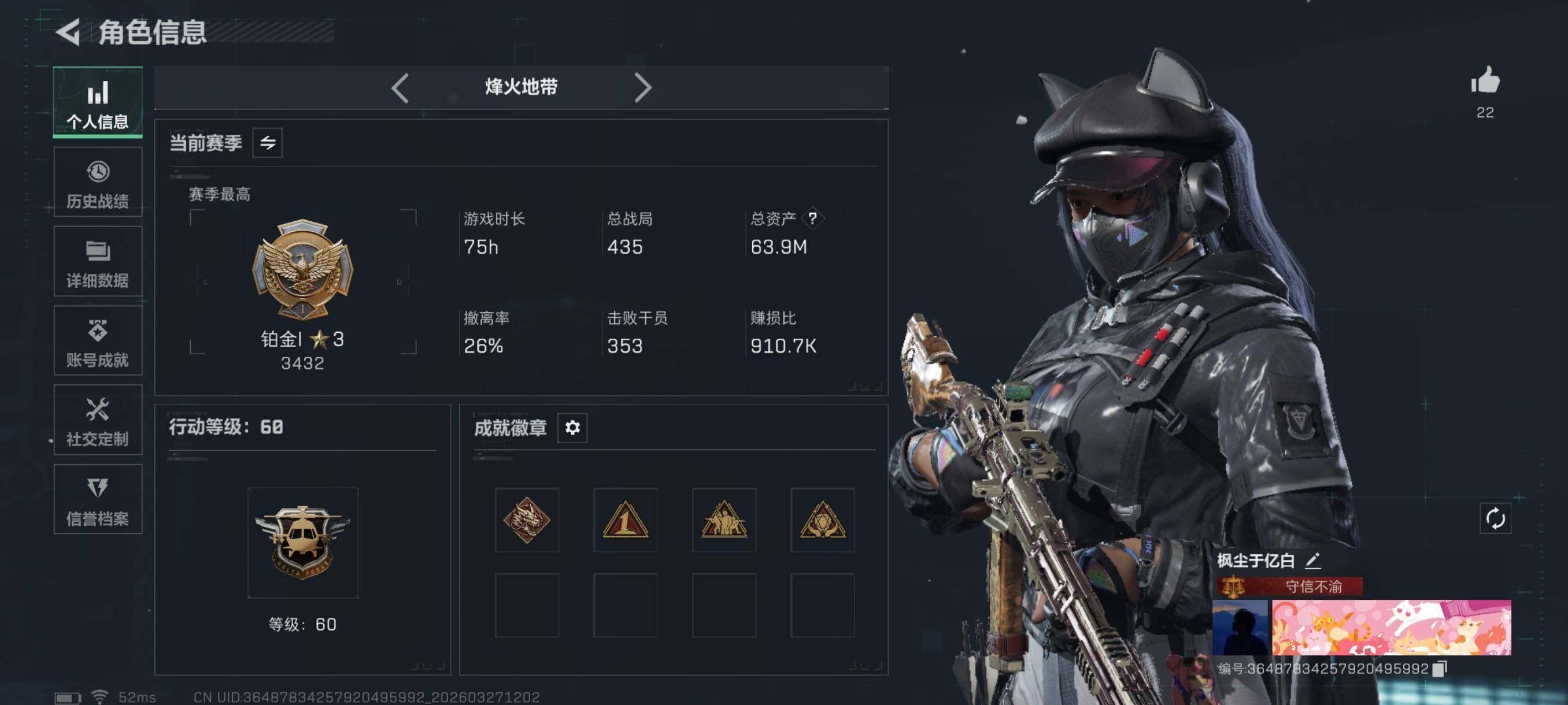 {特价出售}等级:60总资产:63.9M 纯币 747964 红皮:黑天际线 刀皮 影锋 能天使午夜邮差 砖皮: 优品c 巨浪 特勤处:仓库7,训练7,靶场0