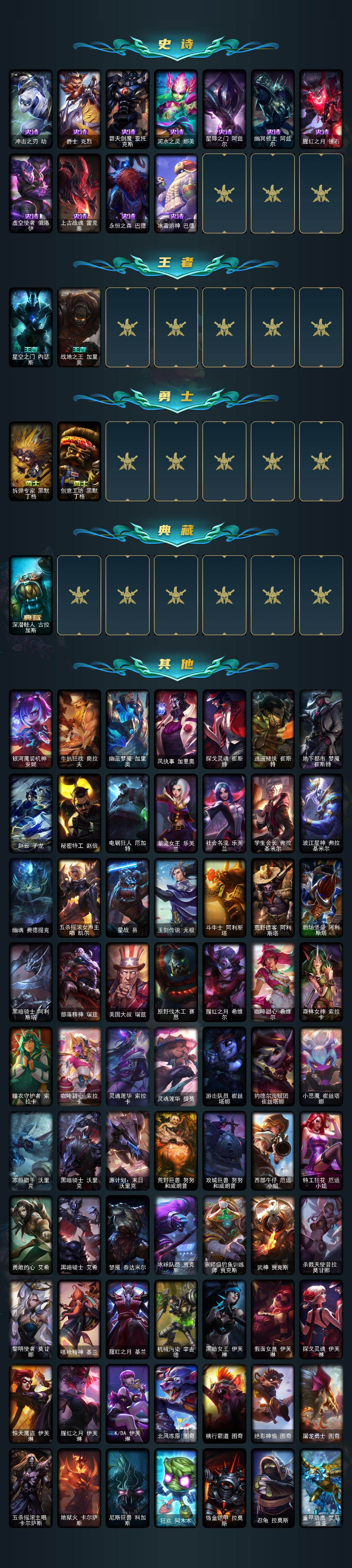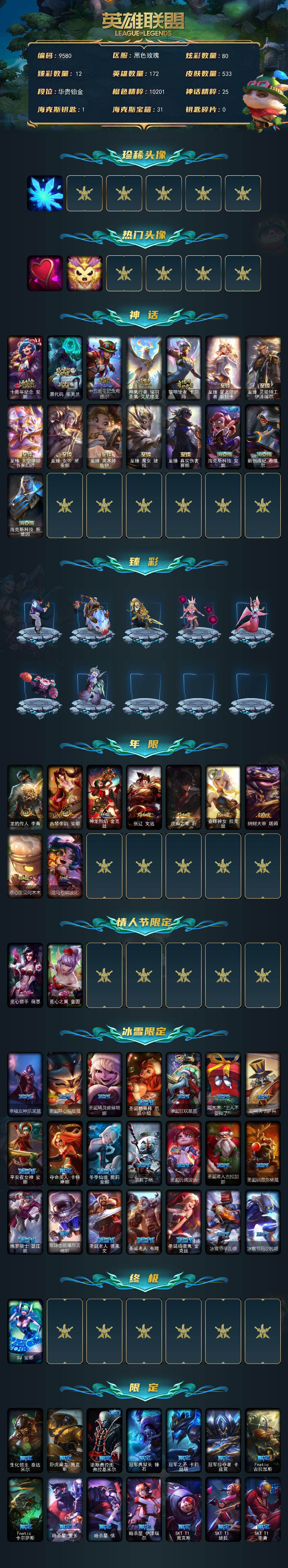 铂金段位-172英雄-533皮肤-80炫彩-1终极-15神话-97限定-42传说-123史诗