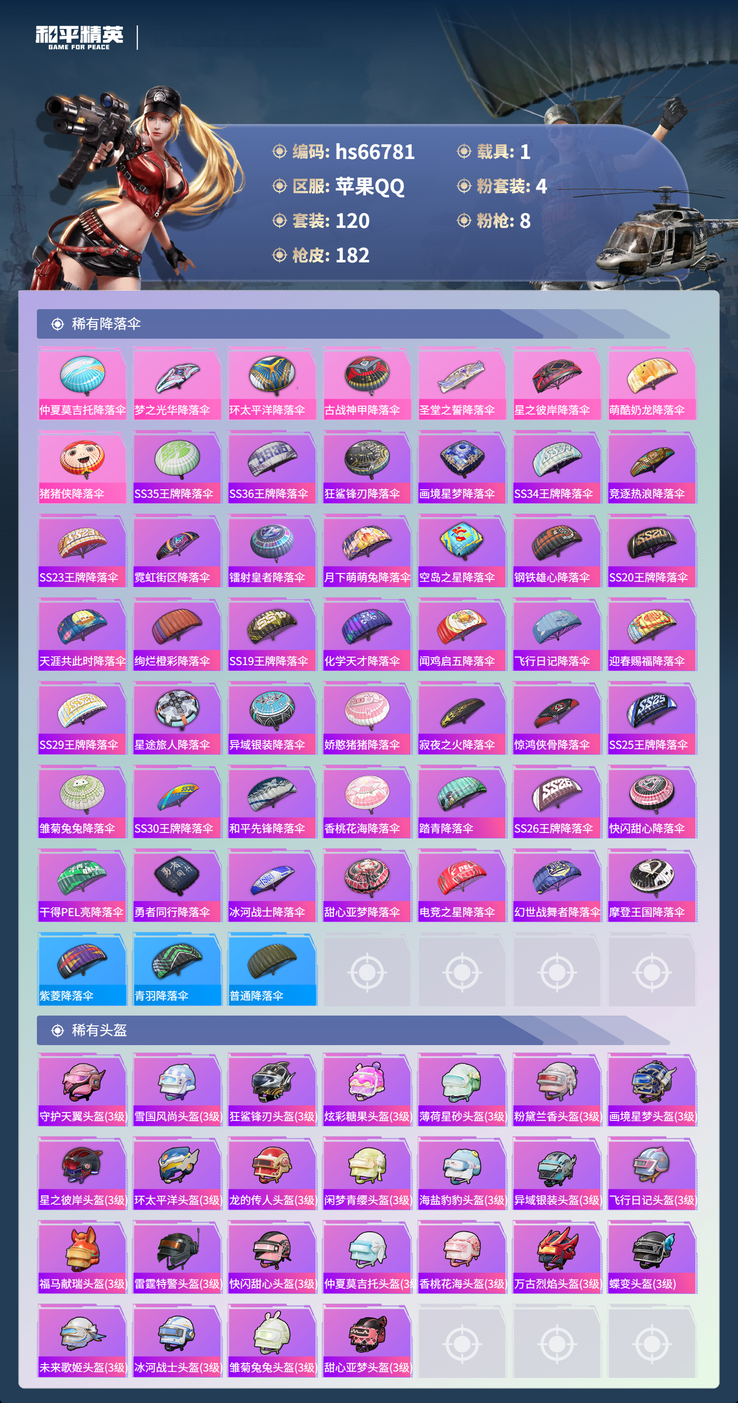 hs66781 苹果手Q-11王牌印记-4粉装-8特效枪-1载具-54397热力值-120套装-182枪皮-1卓越印记-1传奇印记