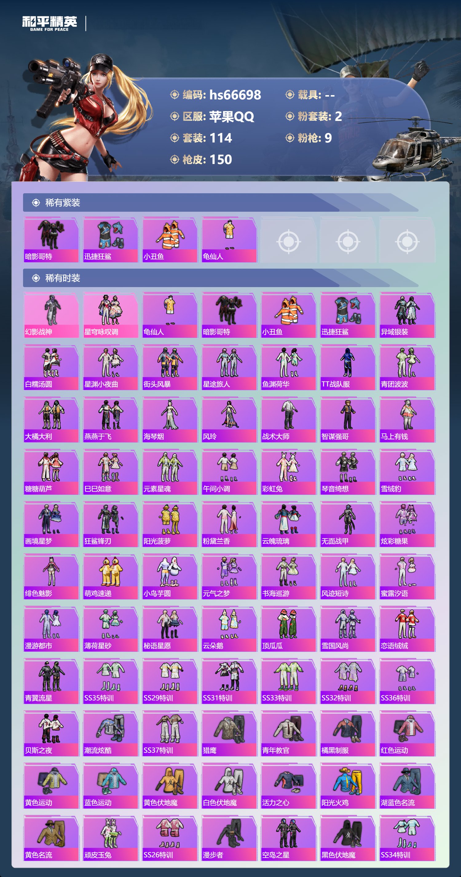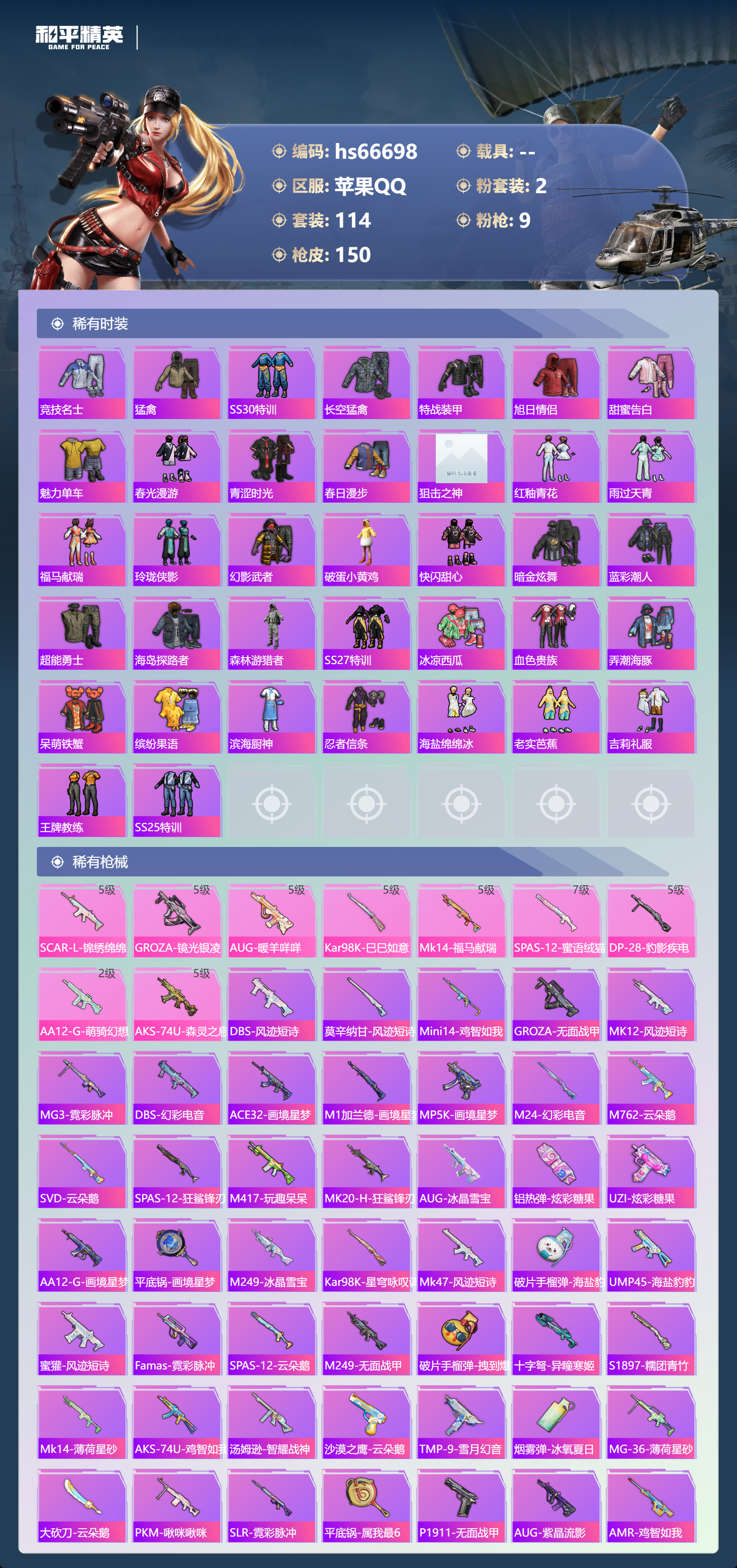 hs66698 苹果手Q-3王牌印记-2粉装-9特效枪-41458热力值-114套装-150枪皮-3卓越印记-2传奇印记
