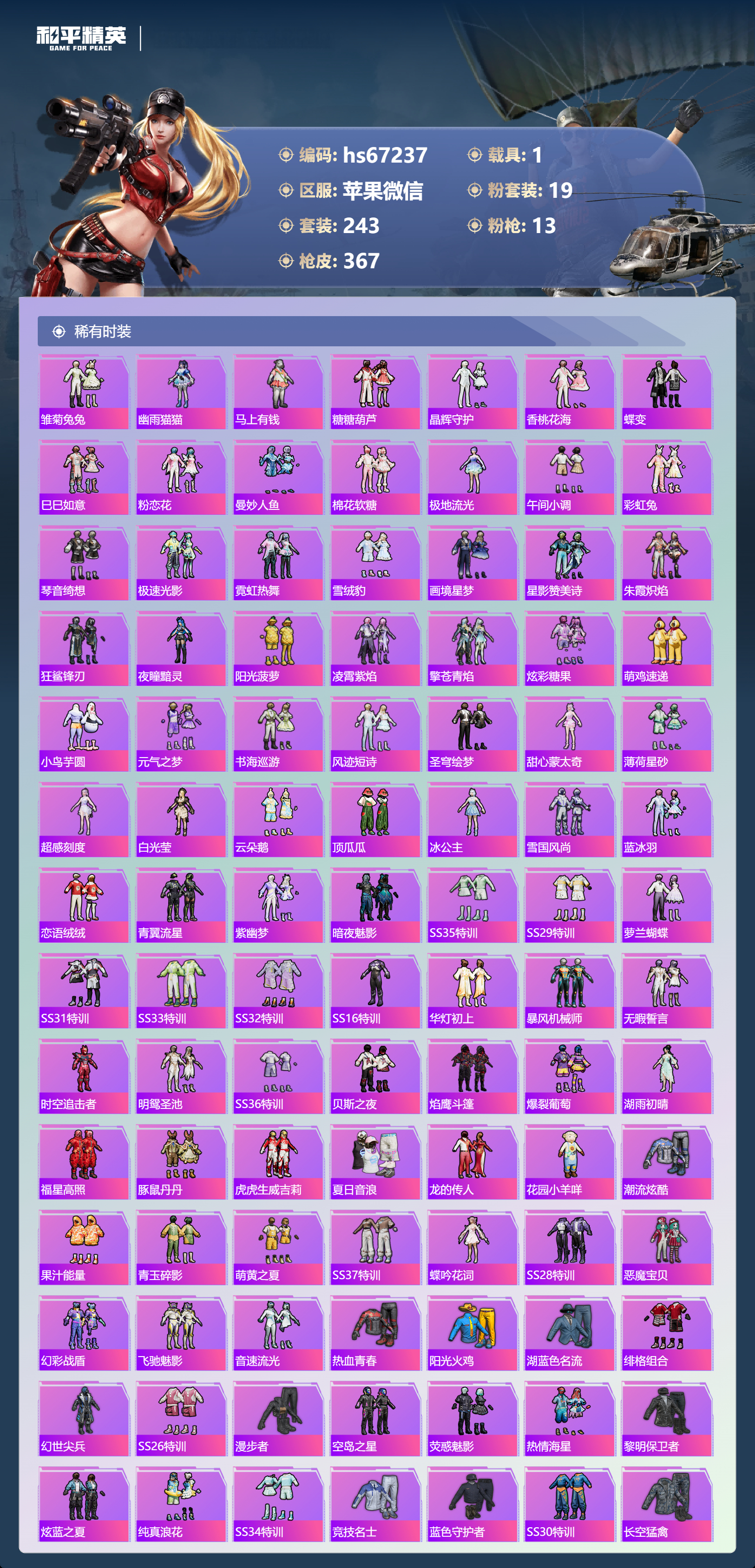 hs67237 苹果微信-19王牌印记-1红装-19粉装-13特效枪-1载具-热力值-243套装-367枪皮-10卓越印记-3传奇印记
