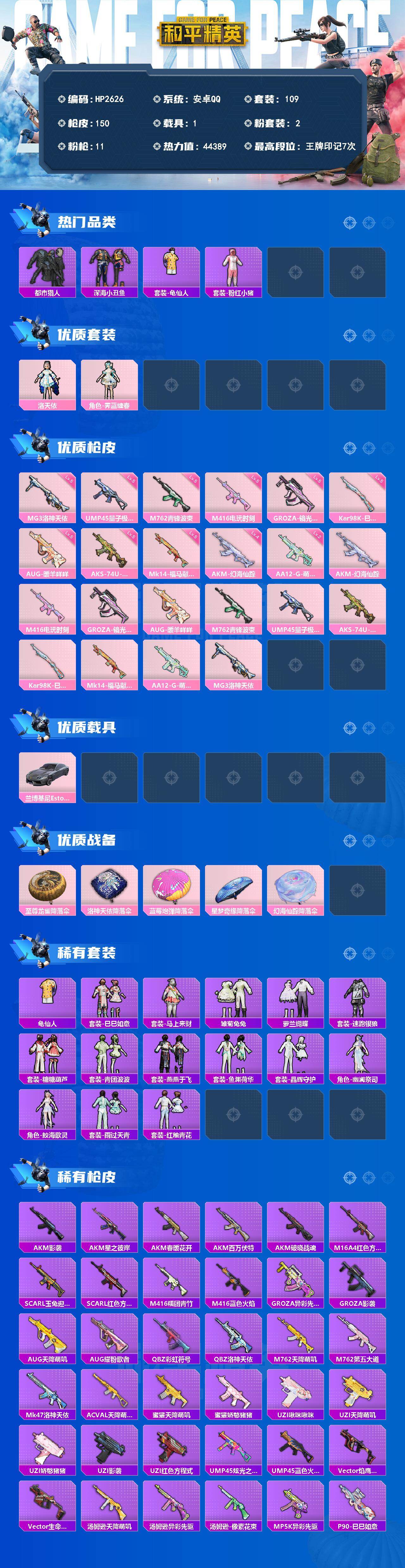 【HP2626】109套装/枪械11/装备157/载具1/战备94/王牌印记7/热力值44389/四级AKM-幻海仙踪/五级M416-电玩时刻/五级GROZA-镜光银凌/五级AUG-暖羊咩咩/五级M762-青锋波束/五级UMP45-量子极限/五级AKS-74U-森灵之息/五级Kar98K-巳巳如意/五级Mk14-福马献瑞/二级AA12-G-萌骑幻想/五级MG3-洛神天依/套装-都市猎人/套装-深海小丑鱼/套装-龟仙人/套装-粉红小猪/角色-洛天依/角色-霁蓝缠春/兰博基尼Estoque(银翼灰)