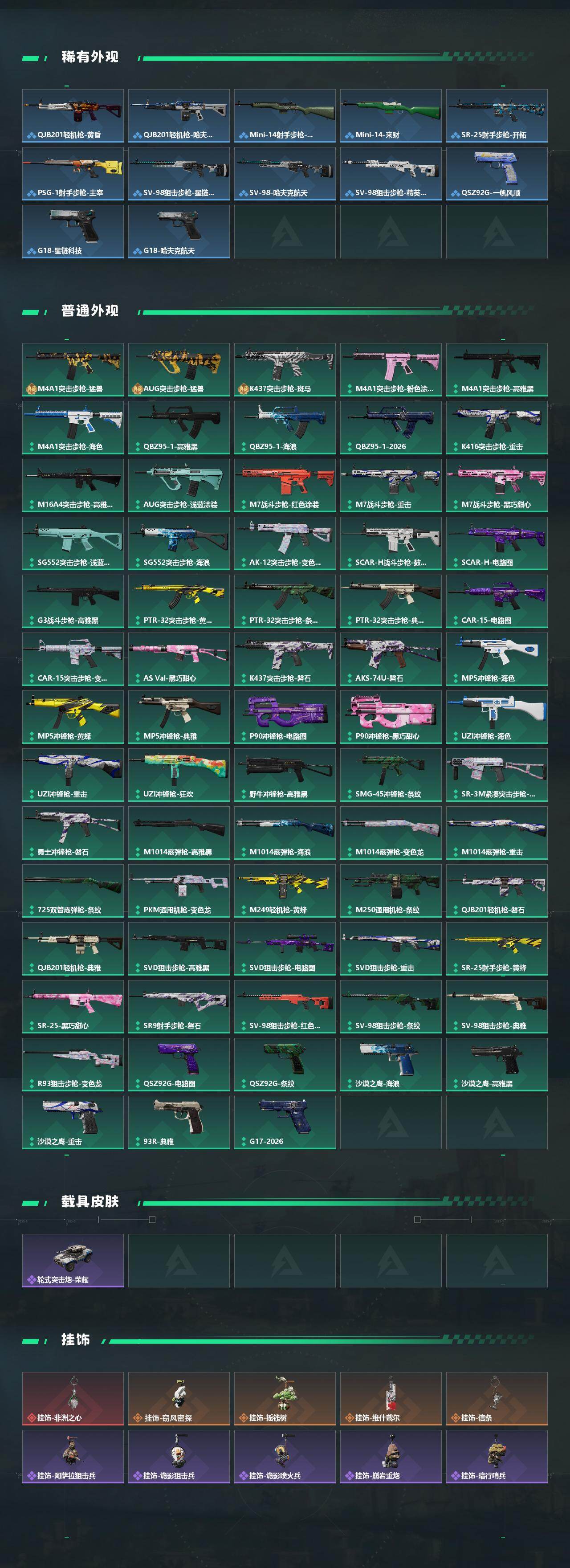 【传说外观】:SG552突击步枪-运动员,SG552突击步枪-点翠,SCAR-H战斗步枪-启航,G3战斗步枪-骑士,CAR-15突击步枪-阿米娅,KC17突击步枪-电锯惊魂,KC17突击步枪-点翠,P90冲锋枪-信条,SR-3M紧凑突击步枪-荼蘼,M250通用机枪-骑士之心,M14射手步枪-蛮荒,M14射手步
