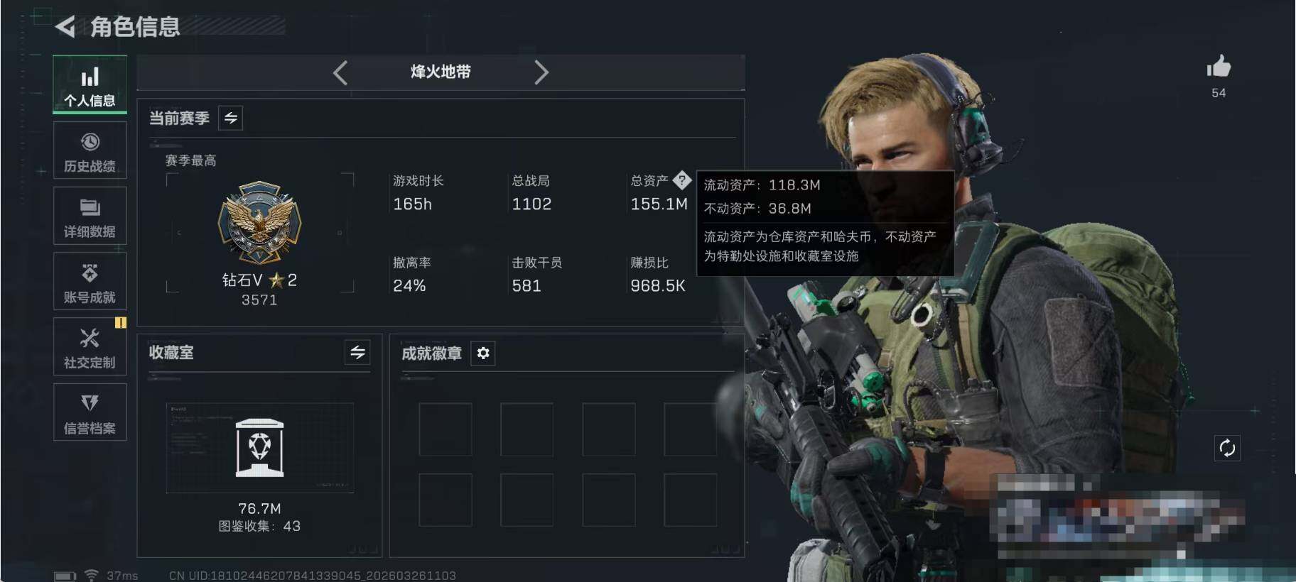 155m总资产-983k哈夫币-60烽火等级-钻石-16战场等级-列兵