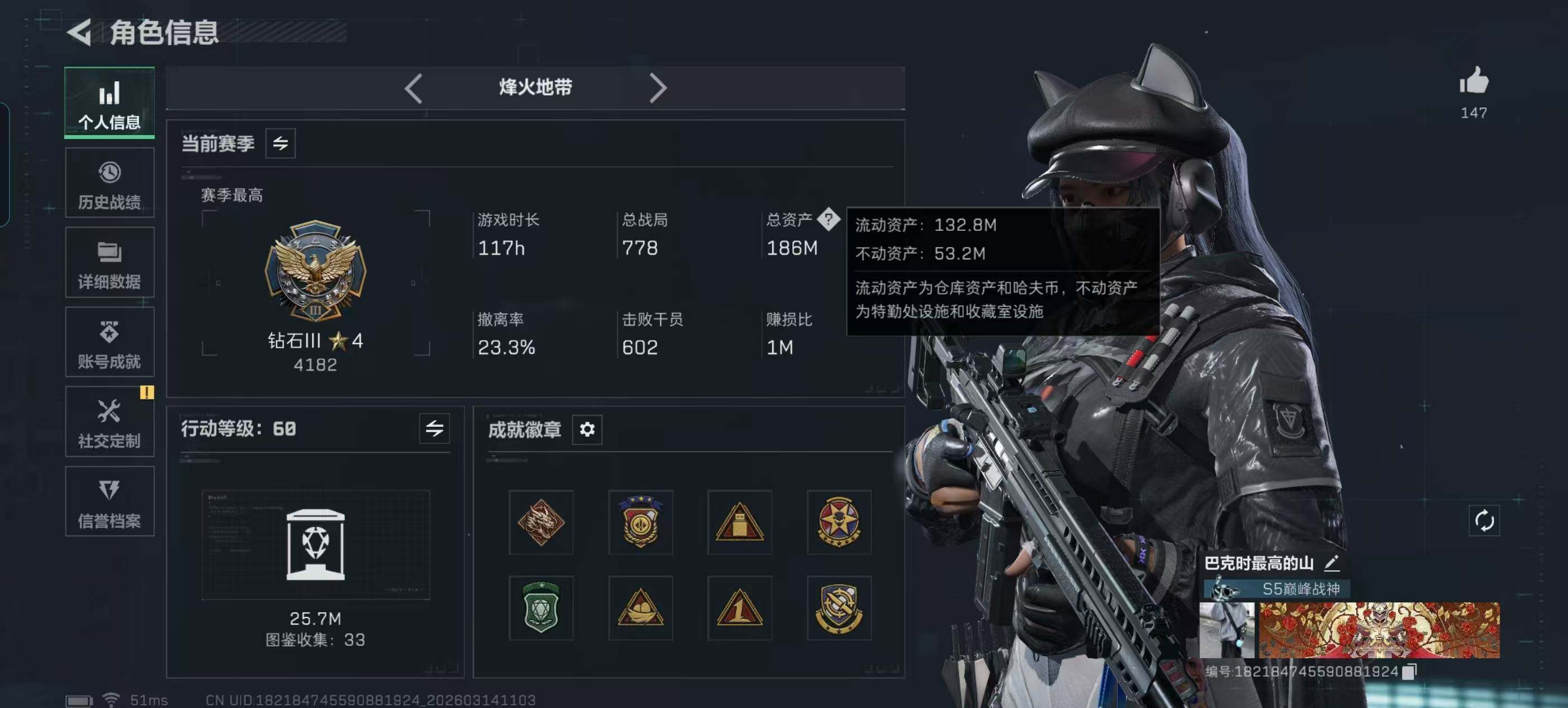 183m总资产-823k哈夫币-60烽火等级-钻石-30战场等