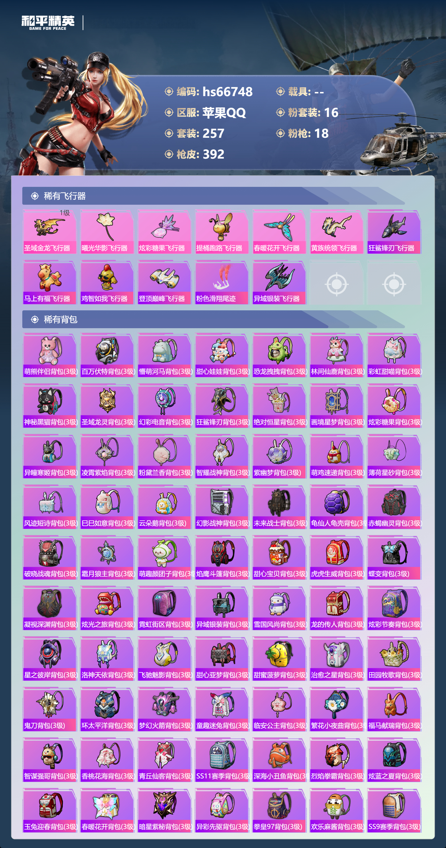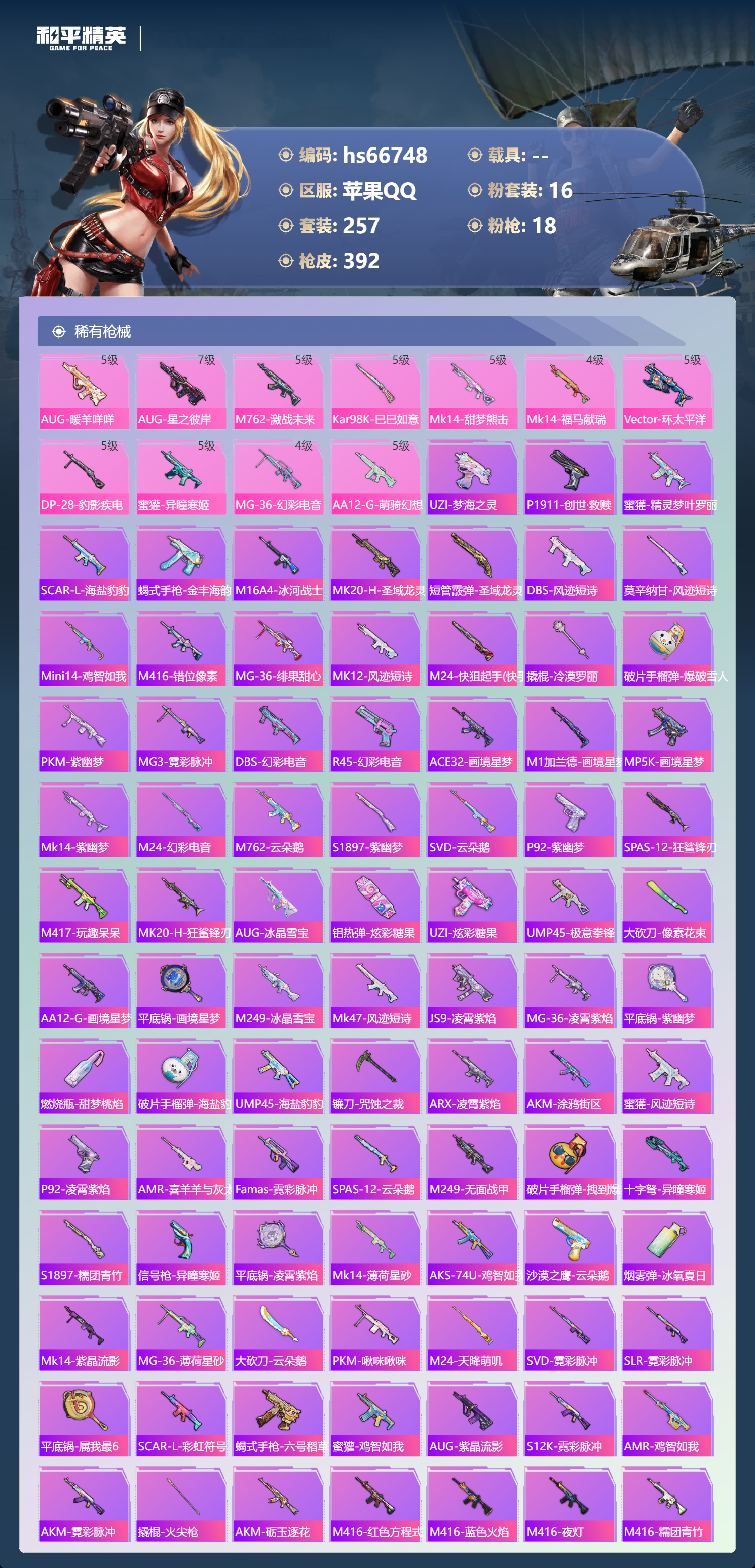 hs66748 苹果手Q-17王牌印记-16粉装-18特效枪-热力值-257套装-392枪皮-2卓越印记-2传奇印记