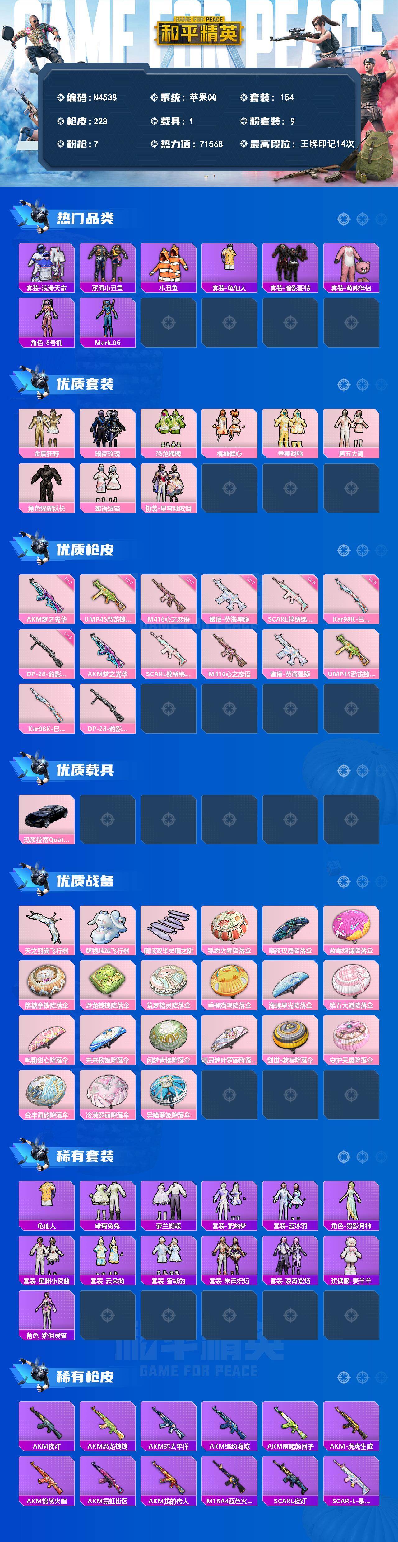 苹果 手Q-9粉装-7特效枪-1载具-3粉色飞行器-71568热力值-14王牌印记-154套装-228枪皮