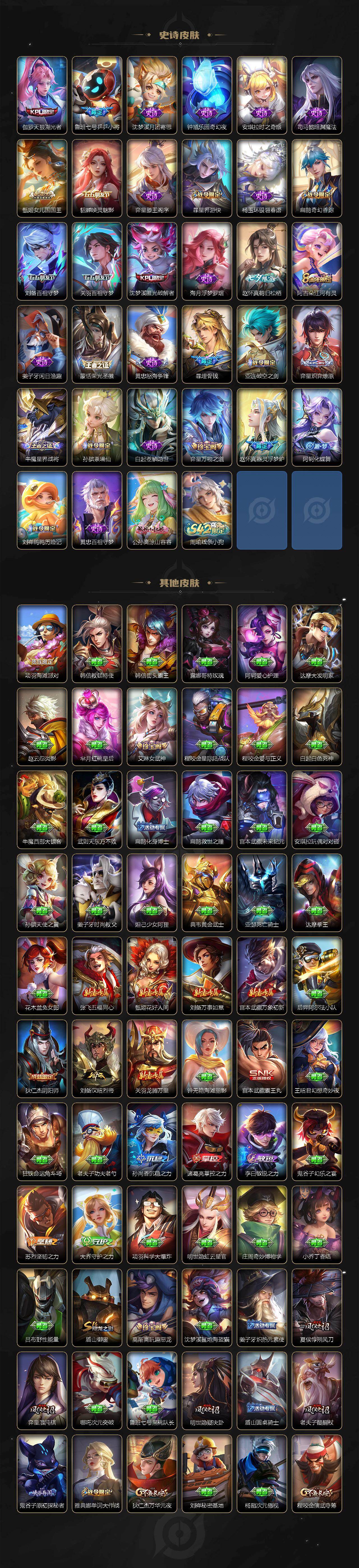 【传说皮肤】:后羿神树通天,虞姬愿照岁时盈,桑启鸣野蒿,貂蝉曦玄引,典韦战鼓燎原,东皇太一灼幽烈阳,诸葛亮鹤羽星尊,张飞百相守梦,夏洛特浮生妄,伽罗炽翼辉光,马可波罗深海之息,孙尚