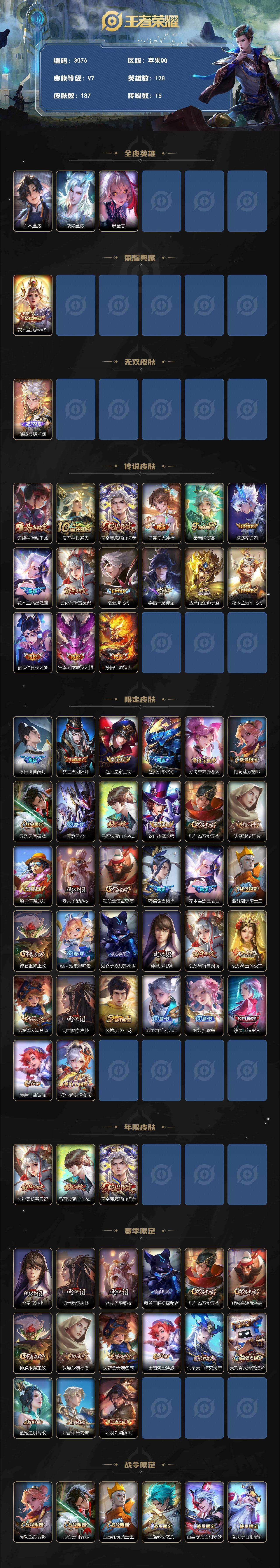 苹果Q-V7-最强王者段位-128英雄-187皮肤-1典藏皮肤-1无双-15传说-48史诗