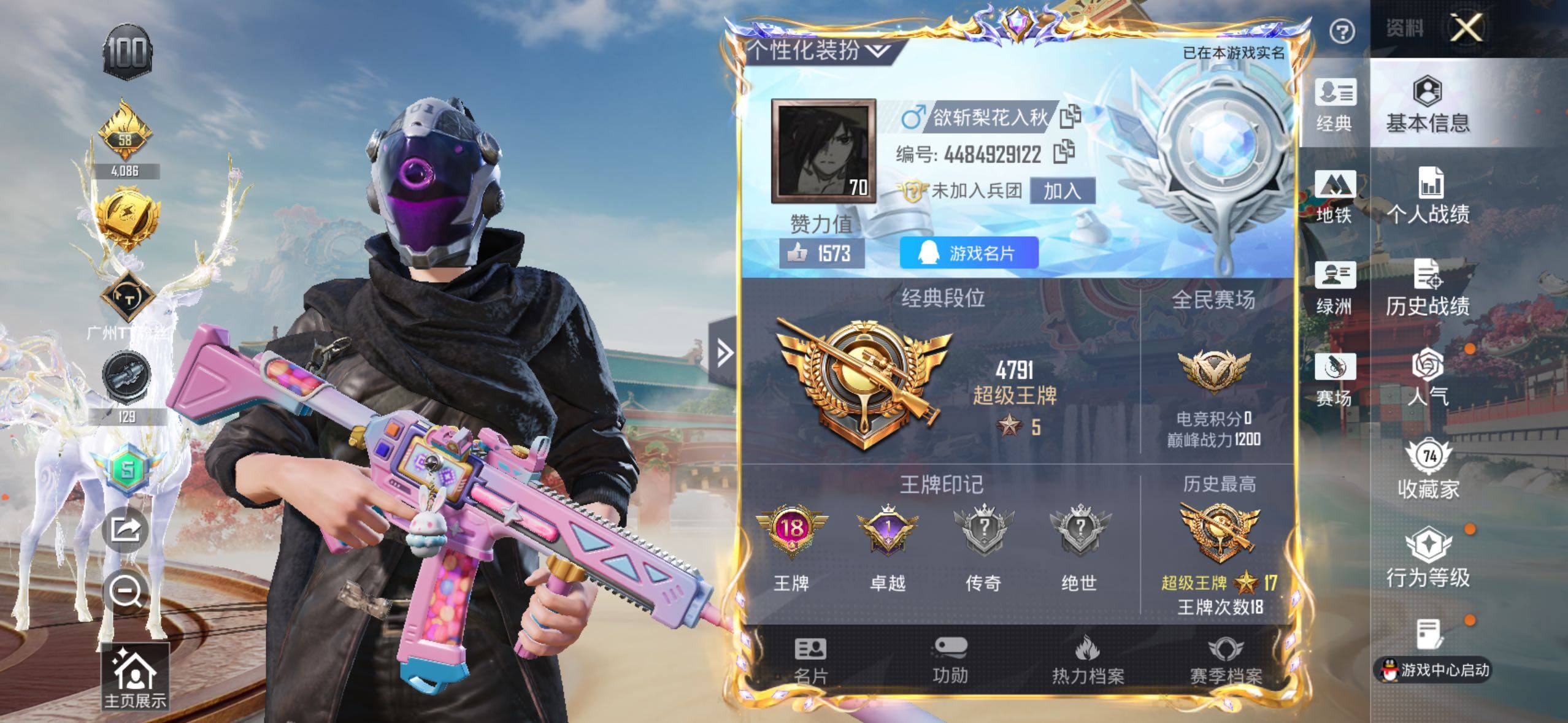 【2016】【地铁满天赋·身法素材号·都市猎人·暗夜之虎·未来歌姬·创世·救赎·九霄玄鹿·蓝螳螂·暗影哥特】苹果 手Q-5粉装-8特效枪-1载具-3粉色飞行器-90947热力值-18王牌印记-240套装-293枪皮