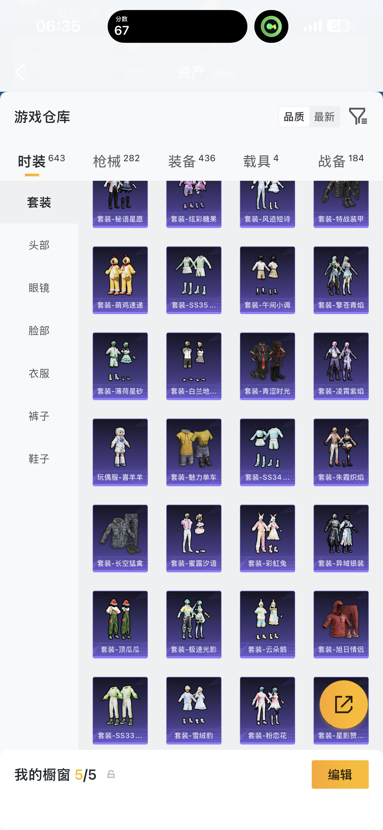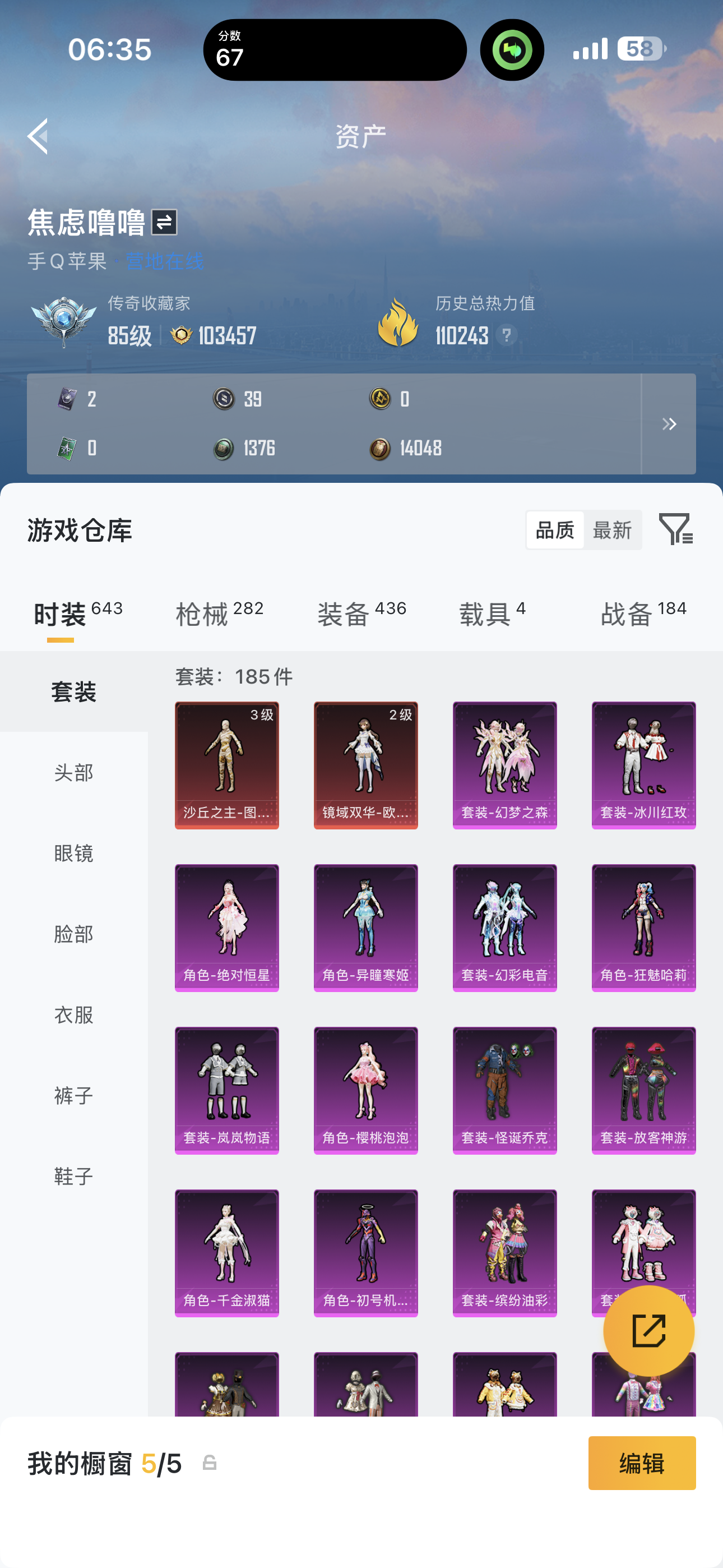 两红 22粉装 21粉枪 5载具 14珍惜飞行器 184套装 283枪皮 热力值:110024 历史