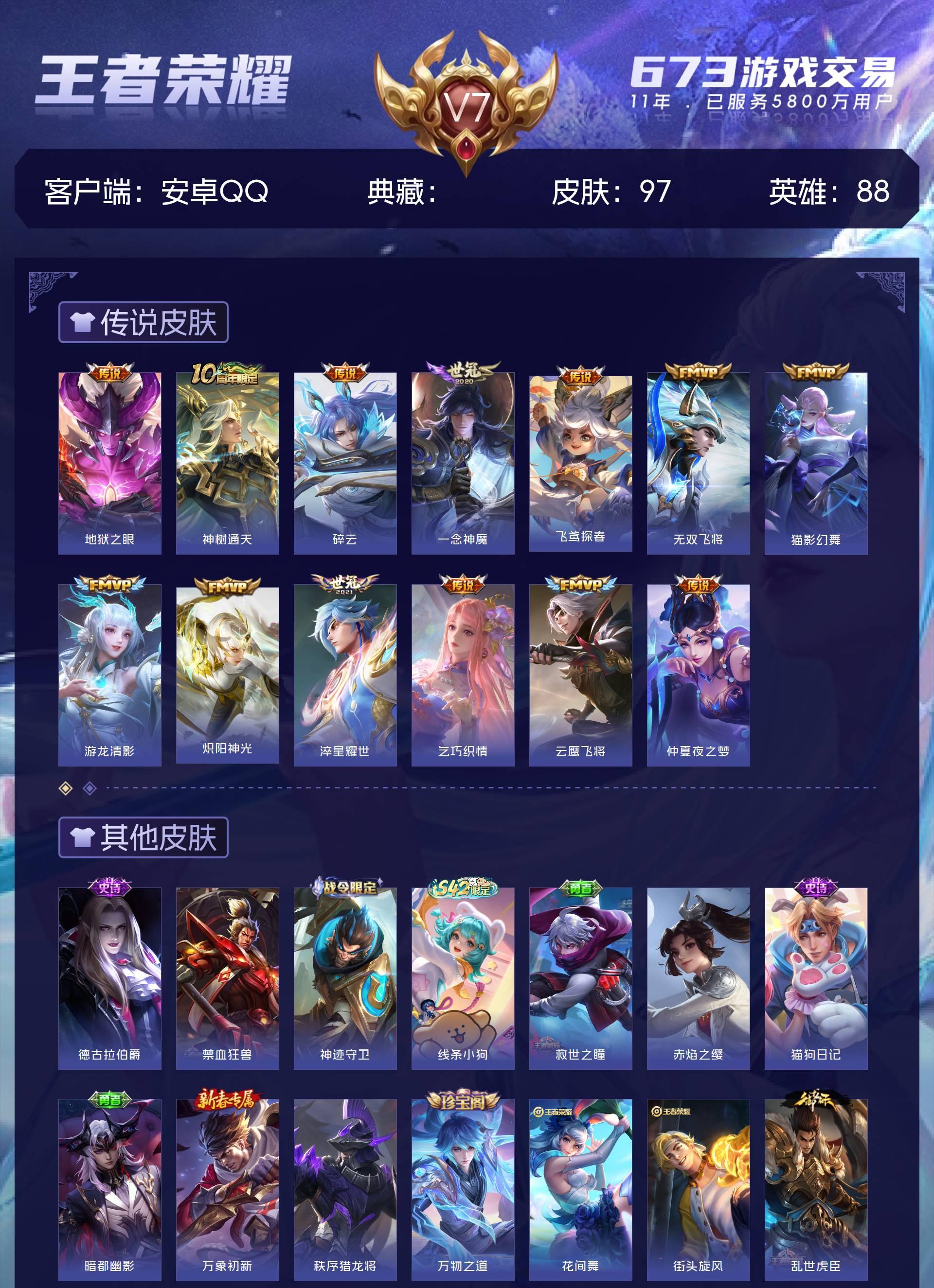 V7 皮肤97 英雄88 至尊星耀 星传说1 传说13