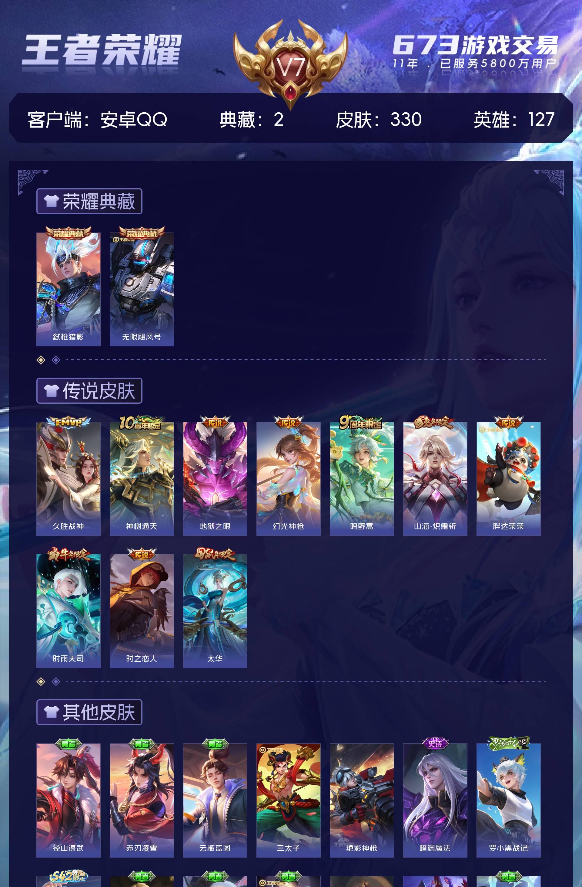 【330皮肤2水晶2星元10传说1天幕可秒换绑】安卓QQ-127英雄-330皮肤【2水晶】 弑枪猎影 无限飓风号【星元皮肤】时之思念 幽冥之眼【传说皮肤】神树通天 鸣野蒿 幻光神枪 太华 地狱之眼 胖达荣荣 山海·炽霜斩 久胜战神 时之恋人 时雨天司 营地ID:450803400