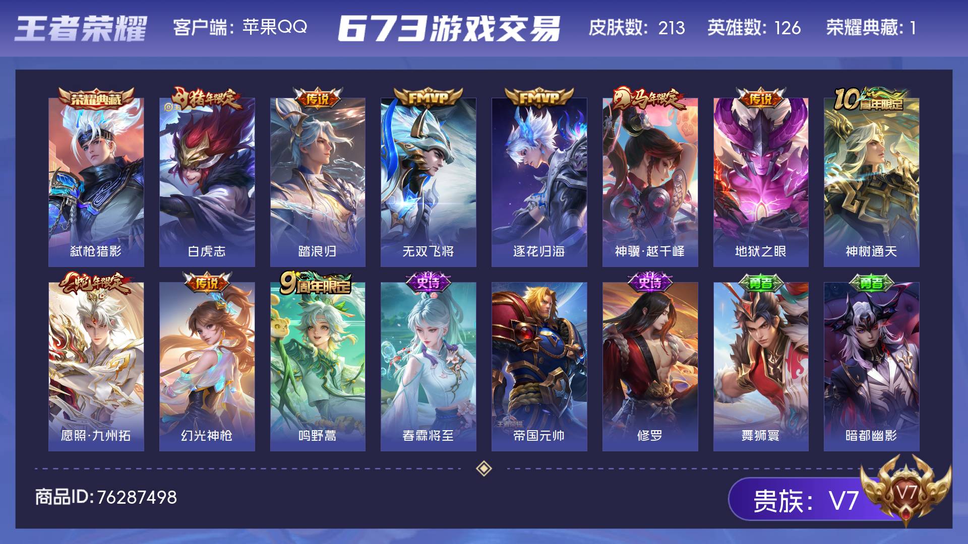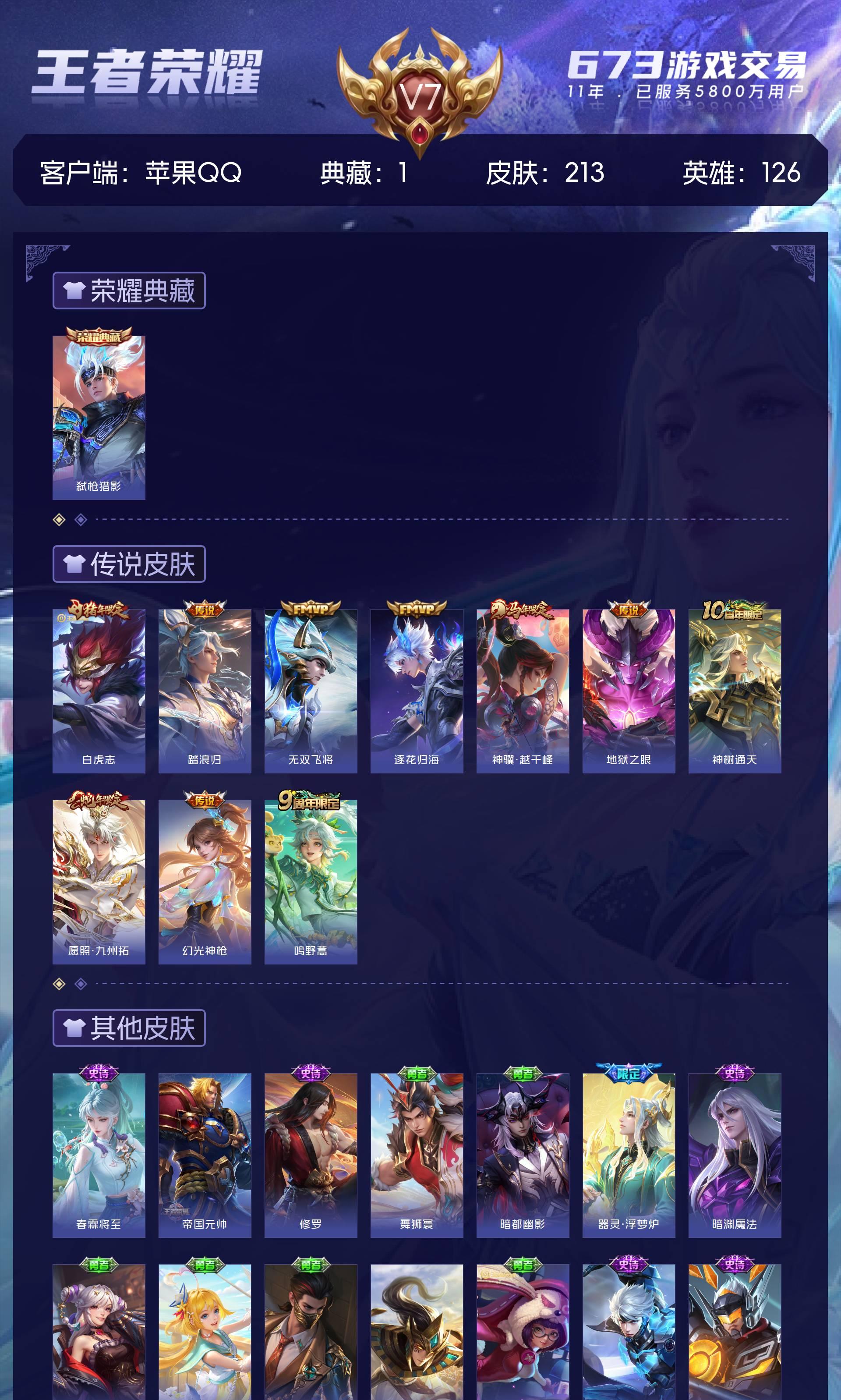 【白虎志踏浪归213皮肤1水晶10传说可秒换绑】苹果QQ-126英雄-213皮肤【1水晶】 弑枪猎影【传说皮肤】神树通天 逐花归海 神骥·越千峰 鸣野蒿 踏浪归 幻光神枪 愿照·九州拓 地狱之眼 无双飞将 白虎志 营地ID:1762088045