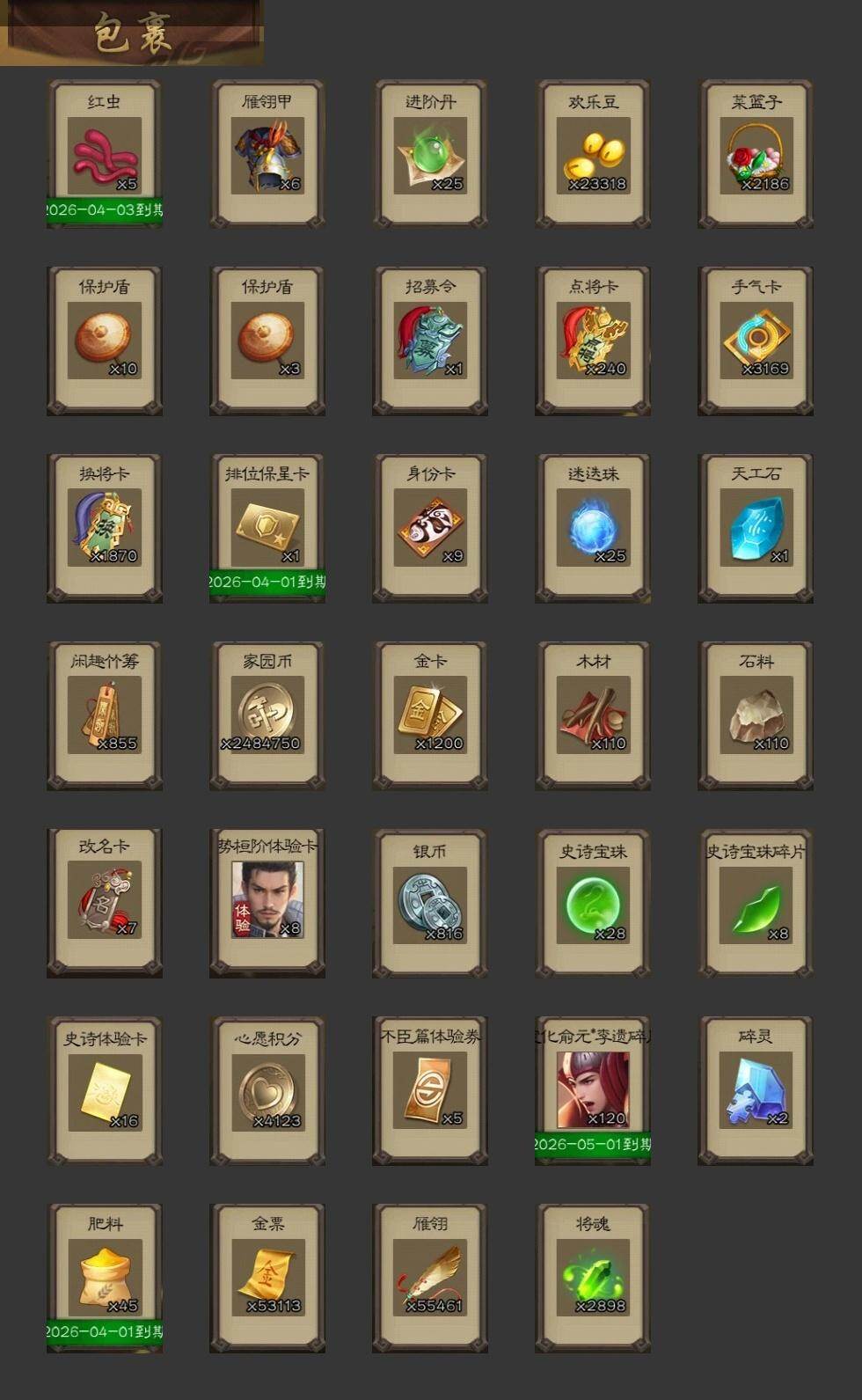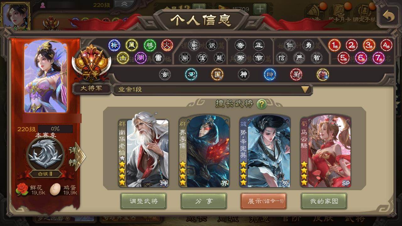 官阶:大将军;VIP等级:VIP12;史诗武将数量:55;动态皮肤数量:56;武将总数:440;史诗宝珠数量:28;将魂数量:2898;神将:9;魏国史诗武将:21;蜀国史诗武将:11;吴国史诗武将:6;群史诗武将:17