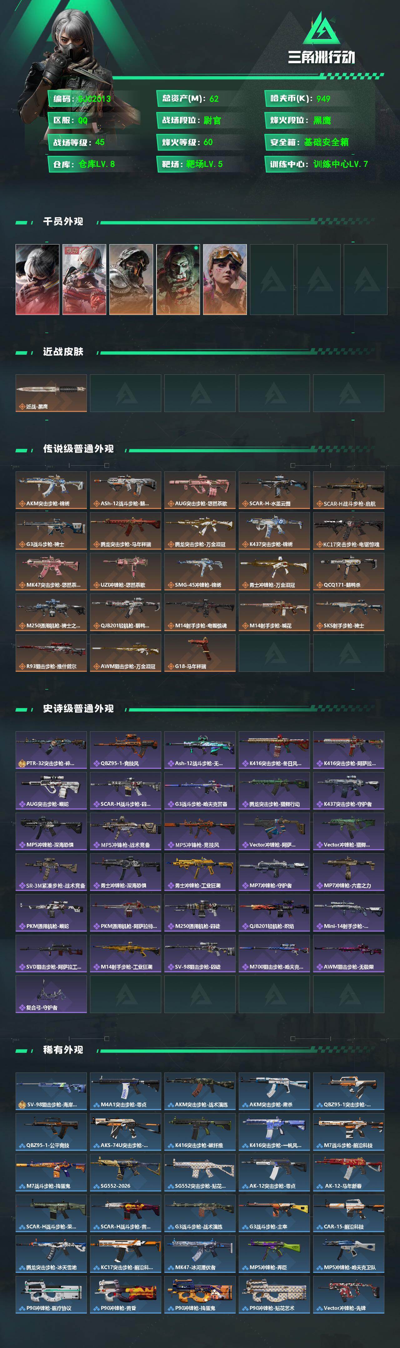 总资产(M):62M/哈夫币(K):949K/传说枪皮数:23/全面战场等级:45_段位:尉官/烽火地带等级:60_段位:黑鹰/骇爪-水墨云图/骇爪-维什戴尔/深蓝-不破誓约/红狼-电锯惊魂/蛊-不羁人生/近战-黑鹰/