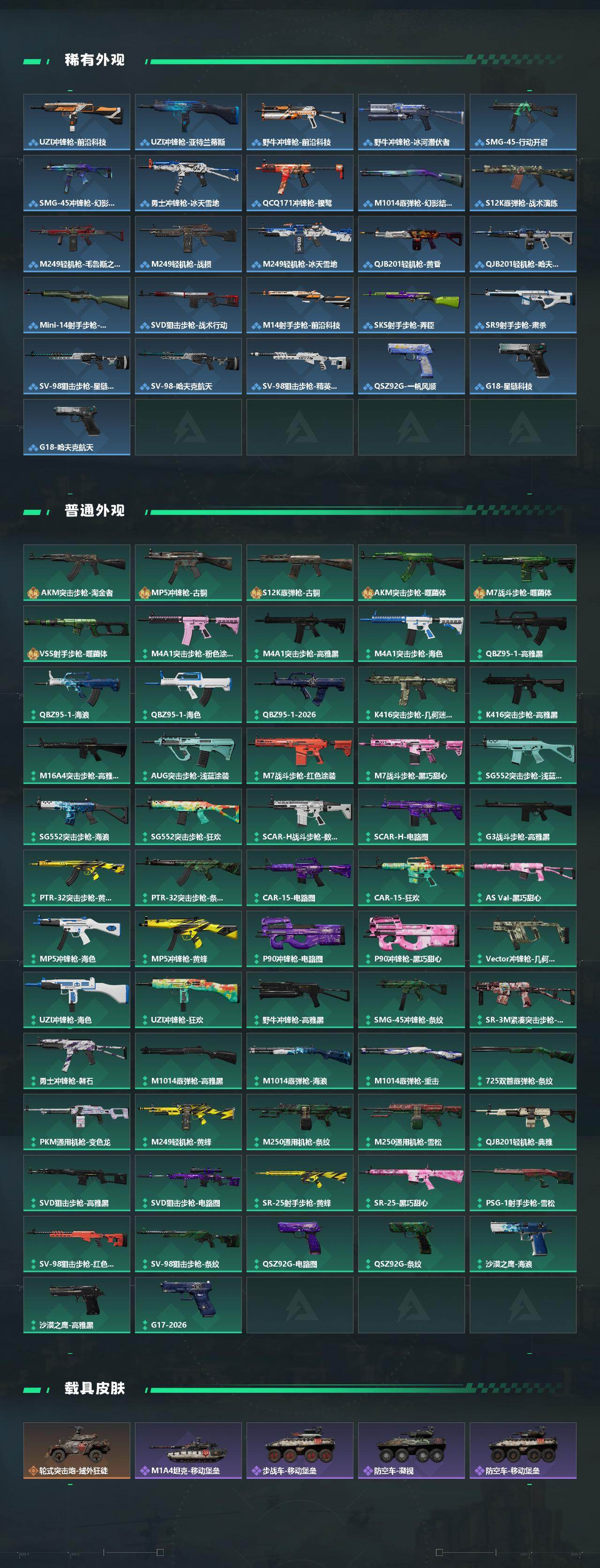 骇爪-水墨云图/骇爪-维什戴尔/深蓝-不破誓约/红狼-电锯惊魂/蛊-不羁人生/近战-黑鹰/AKM突击步枪-锦绣/ASh-12战斗步枪-鹅鸭杀/AUG突击步枪-悠然茶歇/SCAR-H战斗步枪-水墨云图/SCAR-H战斗步枪-启航/G3战斗步枪-骑士/腾龙突击步枪-马年祥瑞/腾龙突击步枪-万金泪冠/K437突击步枪-锦绣/KC17突击步枪-电锯惊魂/MK47突击步枪-悠然茶歇/UZI冲锋枪-悠然茶歇/