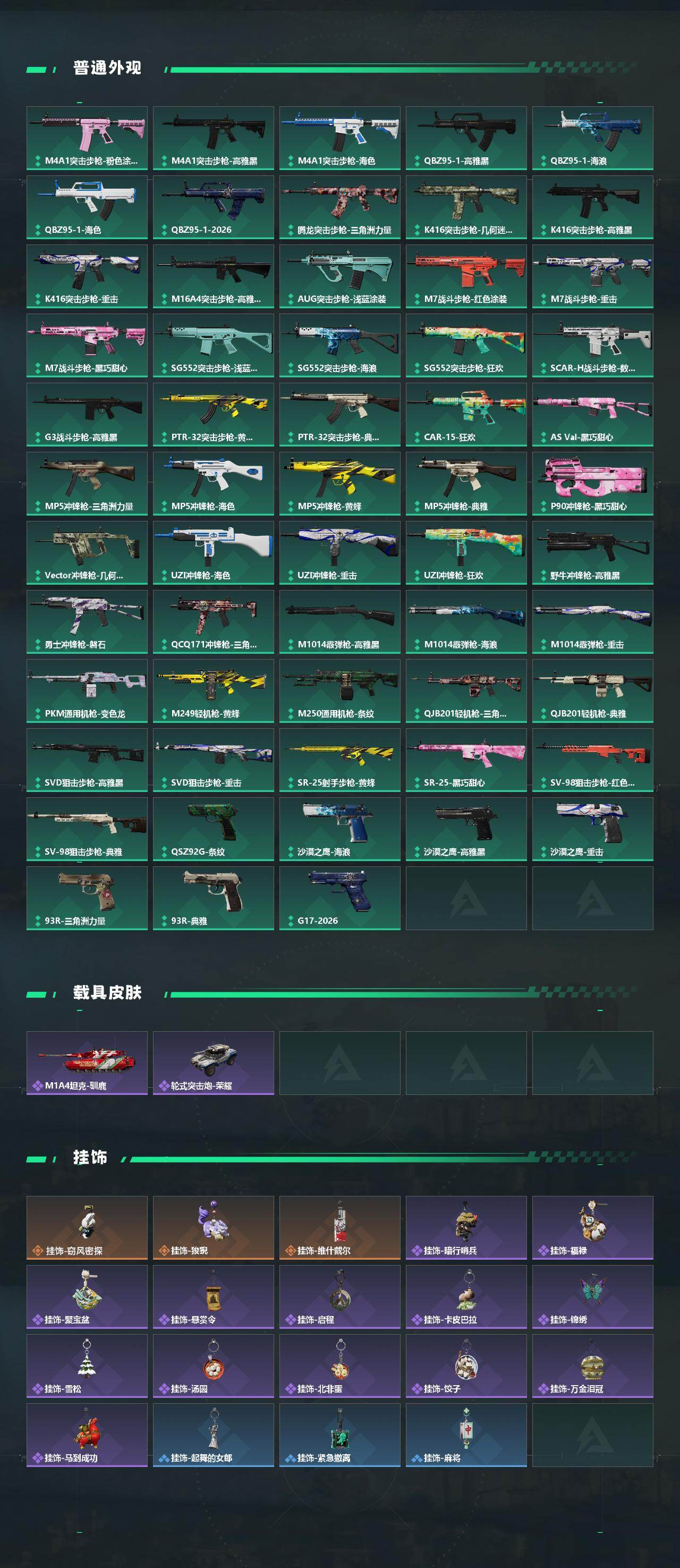 /骇爪-维什戴尔/红狼-电锯惊魂/乌鲁鲁-荒原猎手/近战-黑鹰/AKM突击步枪-锦绣/QBZ95-1突击步枪-凌霄戍卫/SCAR-H战斗步枪-启航/PTR-32突击步枪-赏金猎人/腾龙突击步枪-马年祥瑞/腾龙突击步枪-万金泪冠/K437突击步枪-锦绣/KC17突击步枪-电锯惊魂/SMG-45冲锋枪-锦绣/勇士冲锋枪-万金泪冠/725双管霰弹枪-赏金猎人/M250通用机枪-冥夜蔷薇/