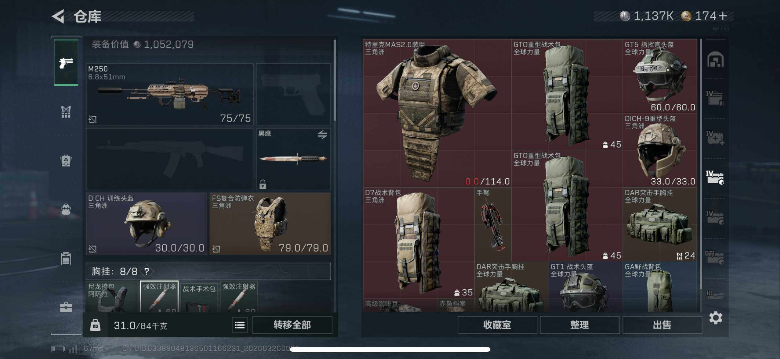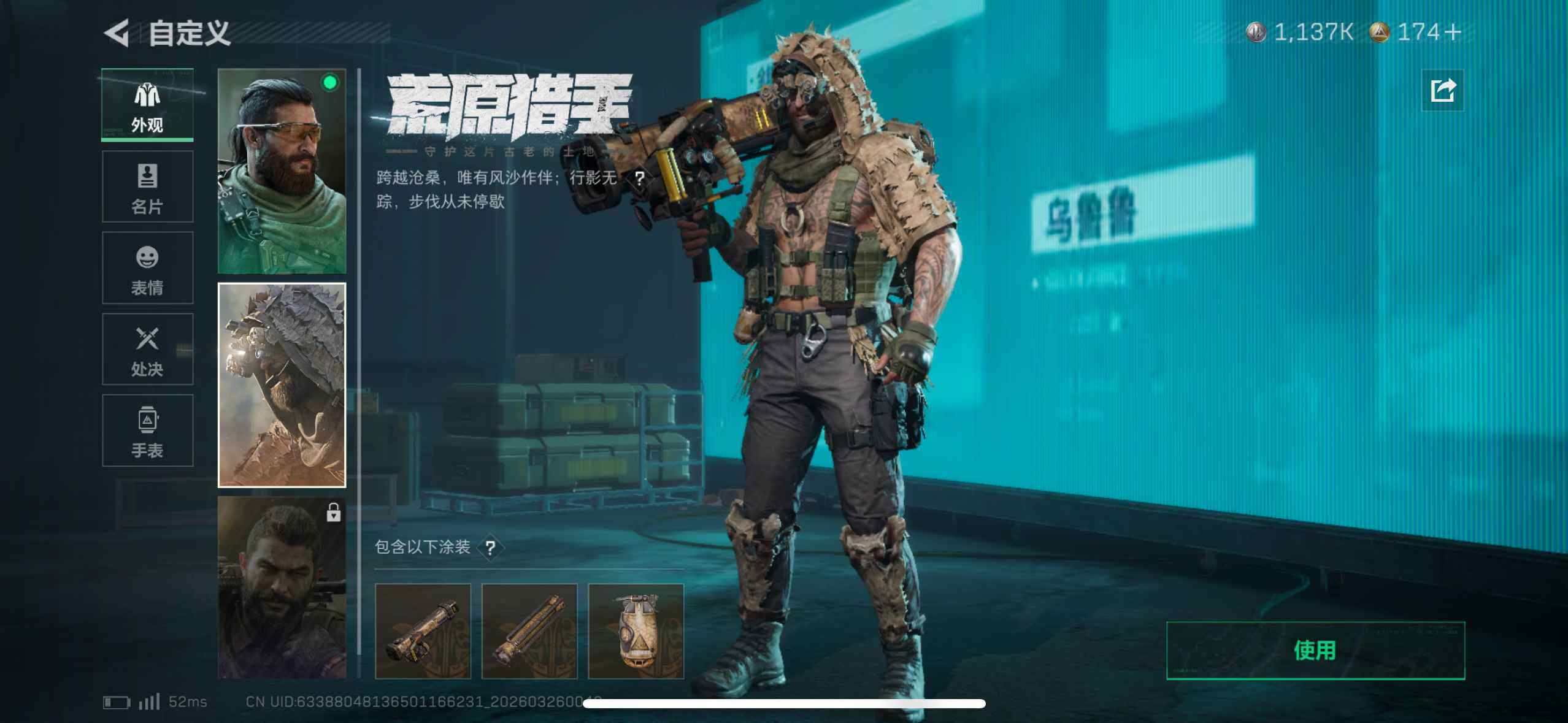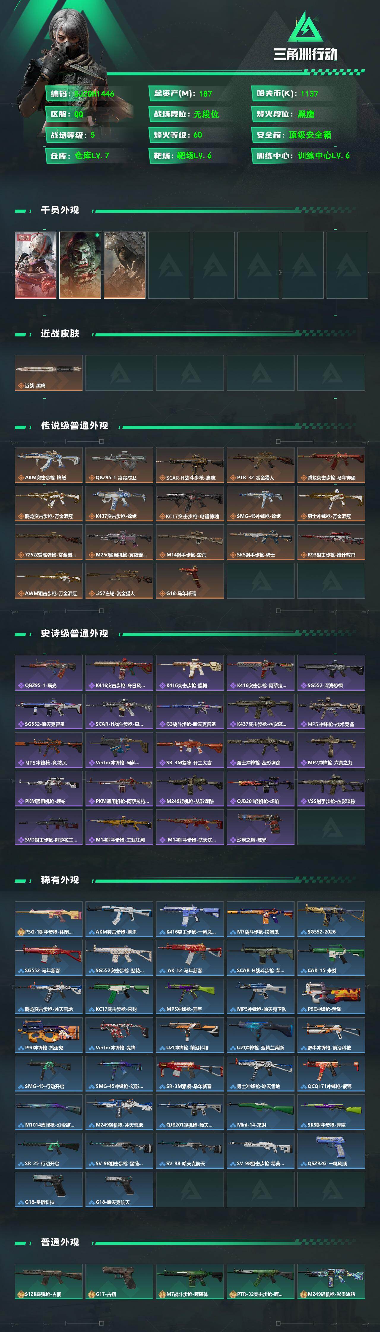 总资产(M):187M/哈夫币(K):1137K/传说枪皮数:18/全面战场等级:5_段位:无段位/烽火地带等级:60_段位:黑鹰/骇爪-维什戴尔/红狼-电锯惊魂/乌鲁鲁-荒原猎手/近战-黑鹰/