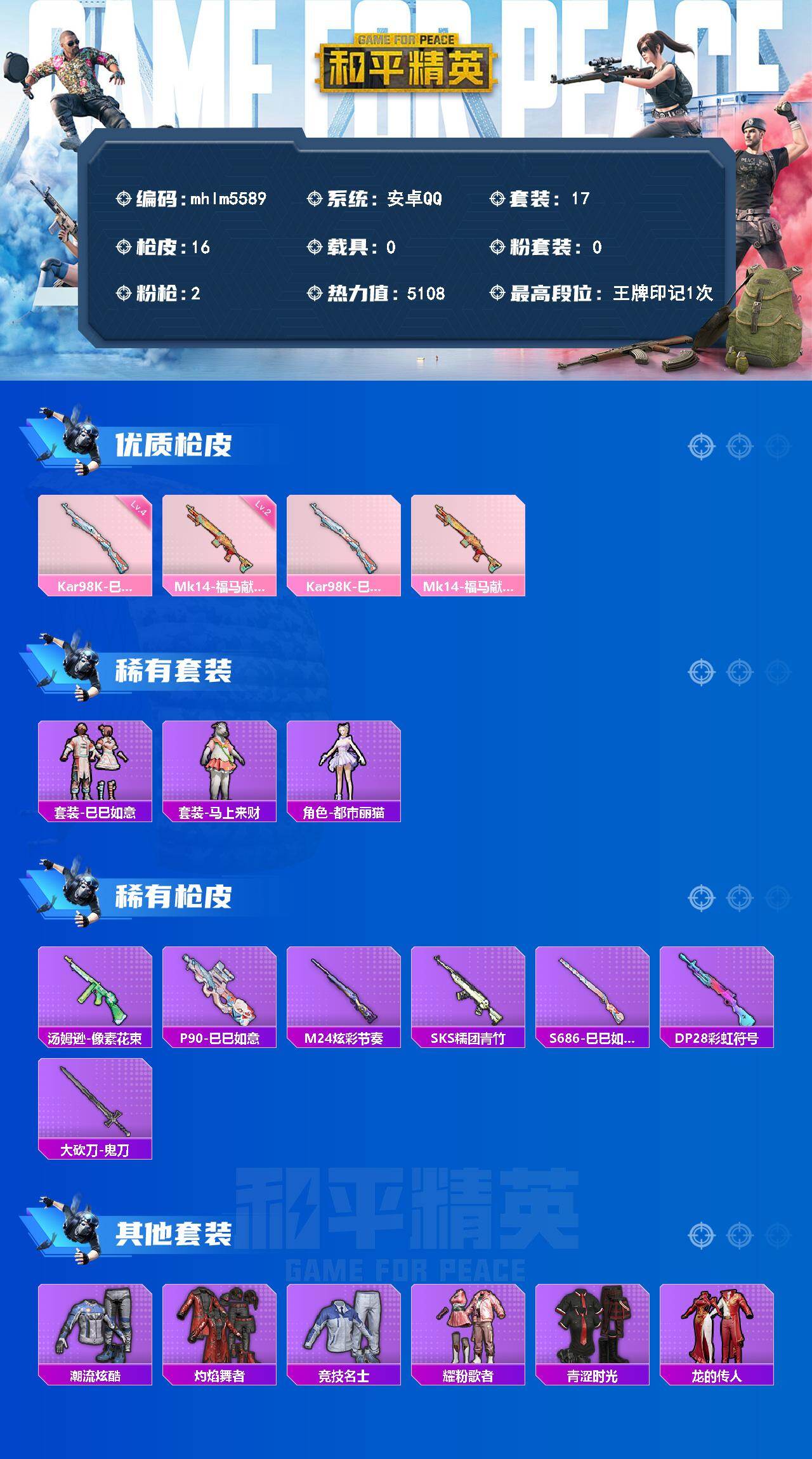 【mhlm5589】安卓 手Q-0粉装-2特效枪-0载具-0粉色飞行器-5108热力值-1王牌印记-17套装-16枪皮
