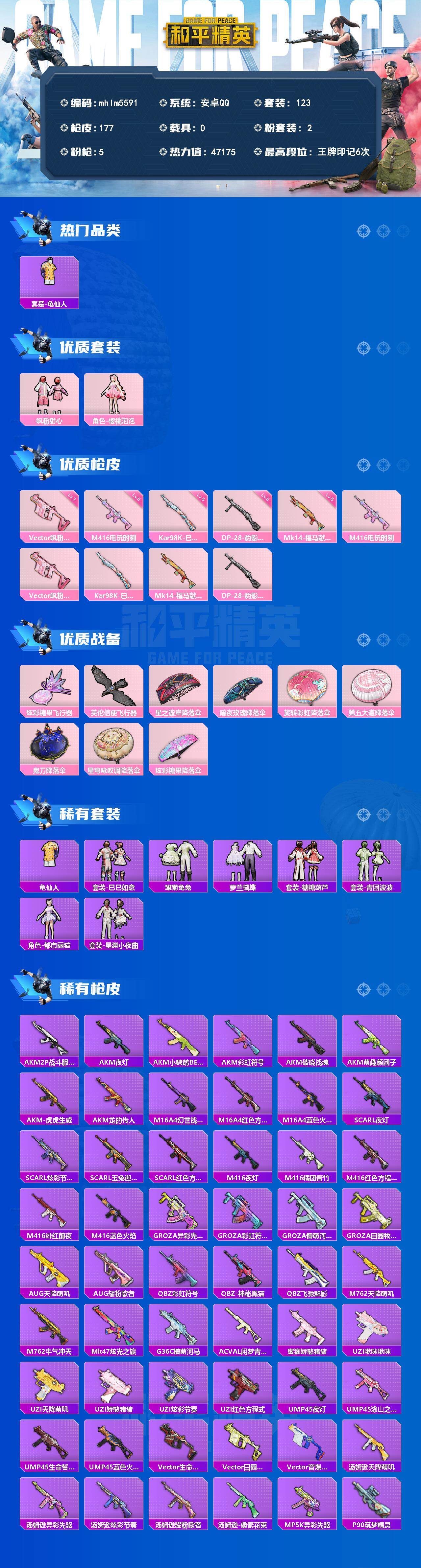 【mhlm5591】安卓 手Q-2粉装-5特效枪-0载具-2粉色飞行器-47175热力值-6王牌印记-123套装-177枪皮