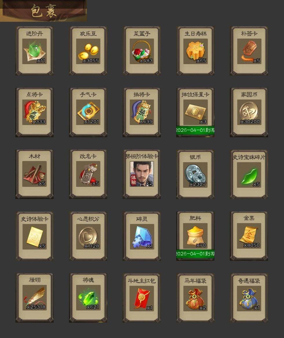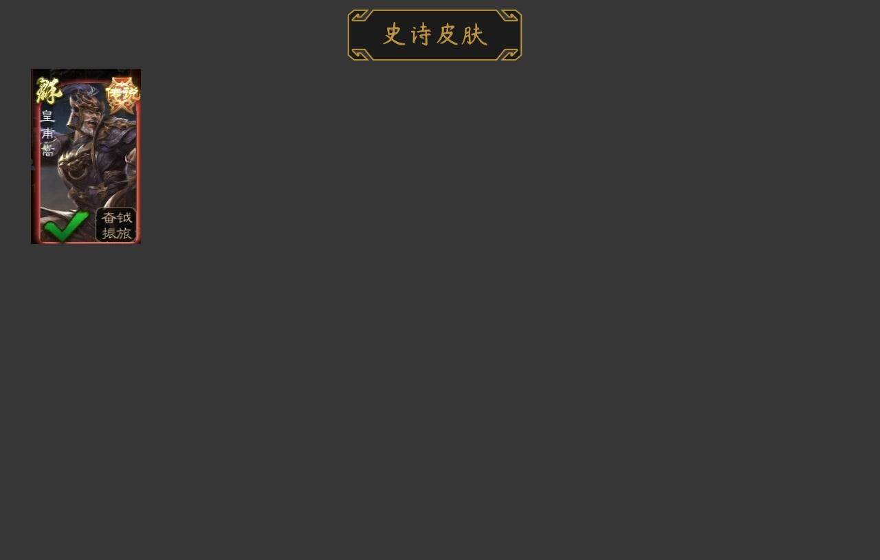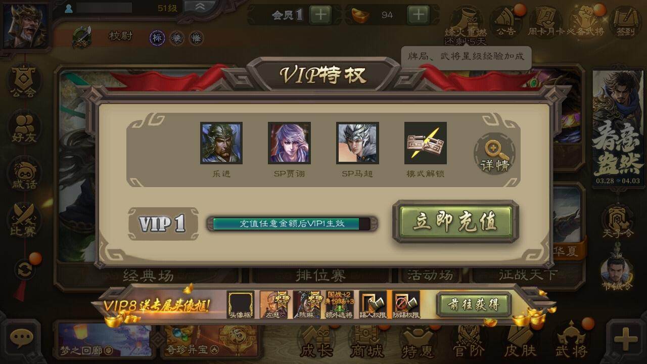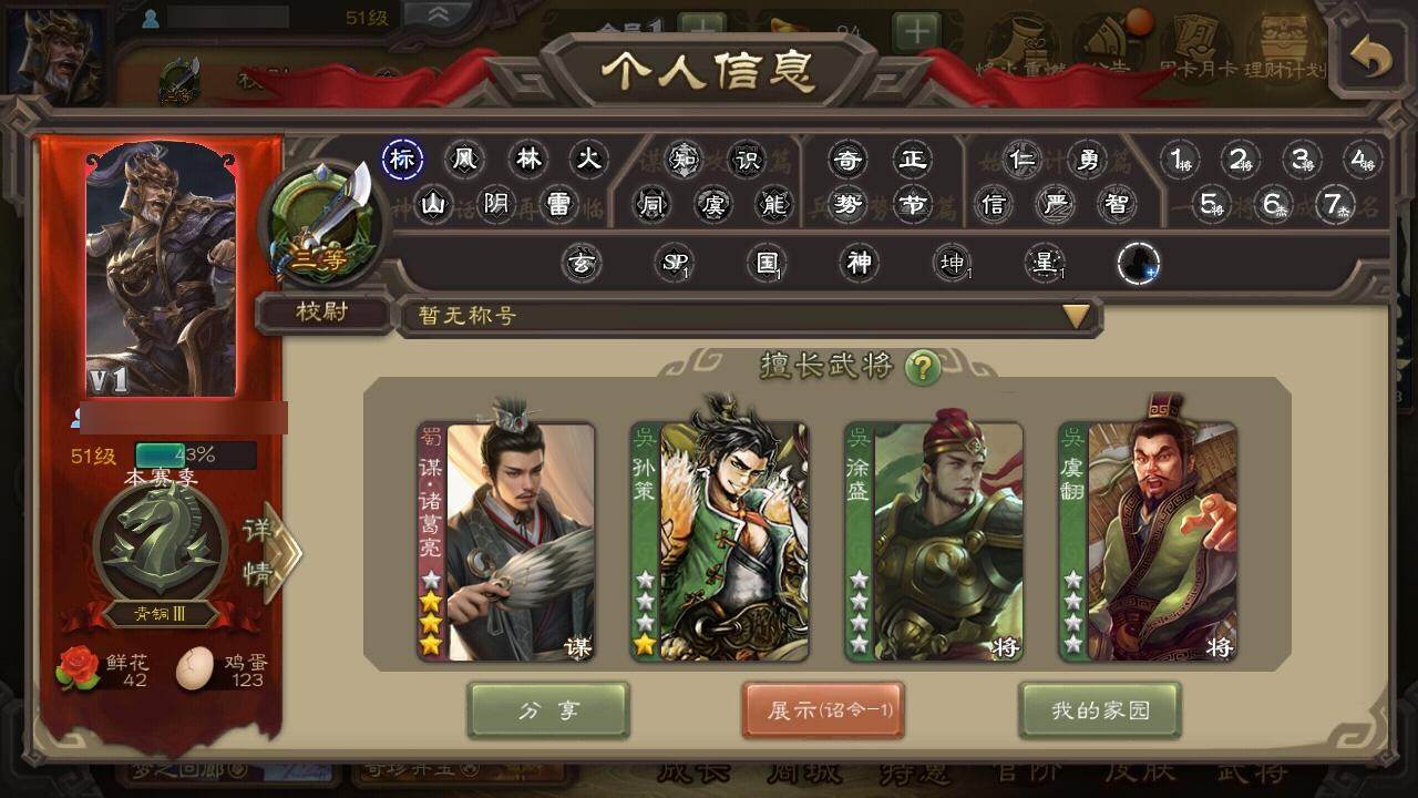 官阶:先锋将军;VIP等级:VIP1;史诗武将数量:1;动态皮肤数量:1;武将