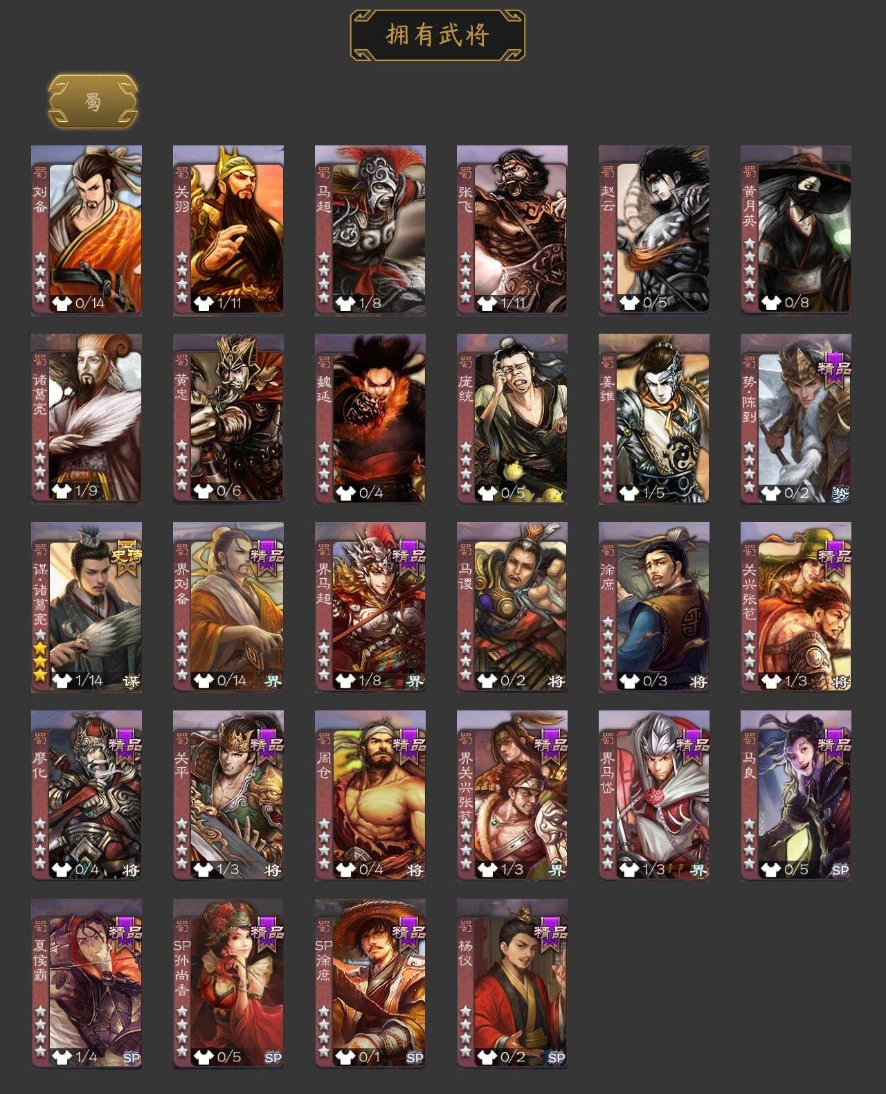 谋诸葛亮,曹昂,诸葛诞,朱灵,文聘,钟会,郭淮,界王异,界曹操,界司马懿,界夏侯惇,曹真,韩浩史涣,陈群,曹休,司马朗,李通,卞夫人,王双,胡班,势陈到,SP孙尚香,夏侯霸,马良,关兴张苞,廖